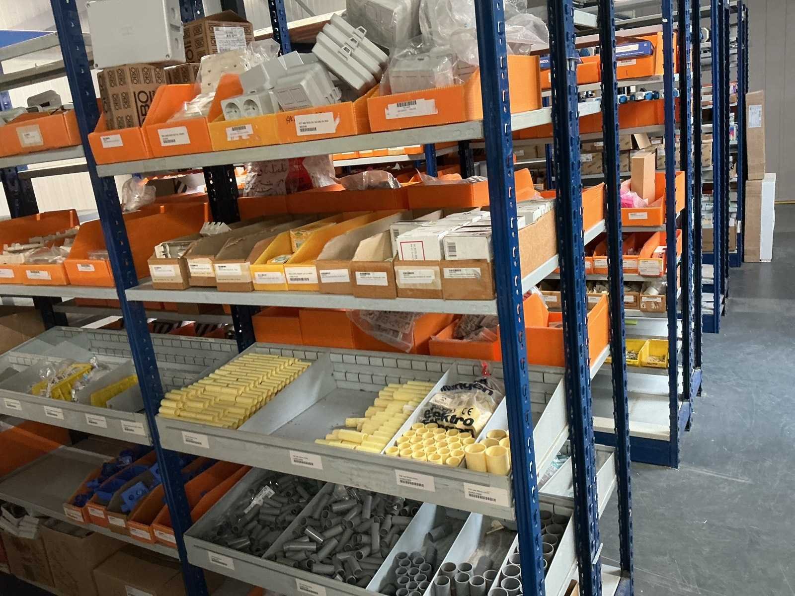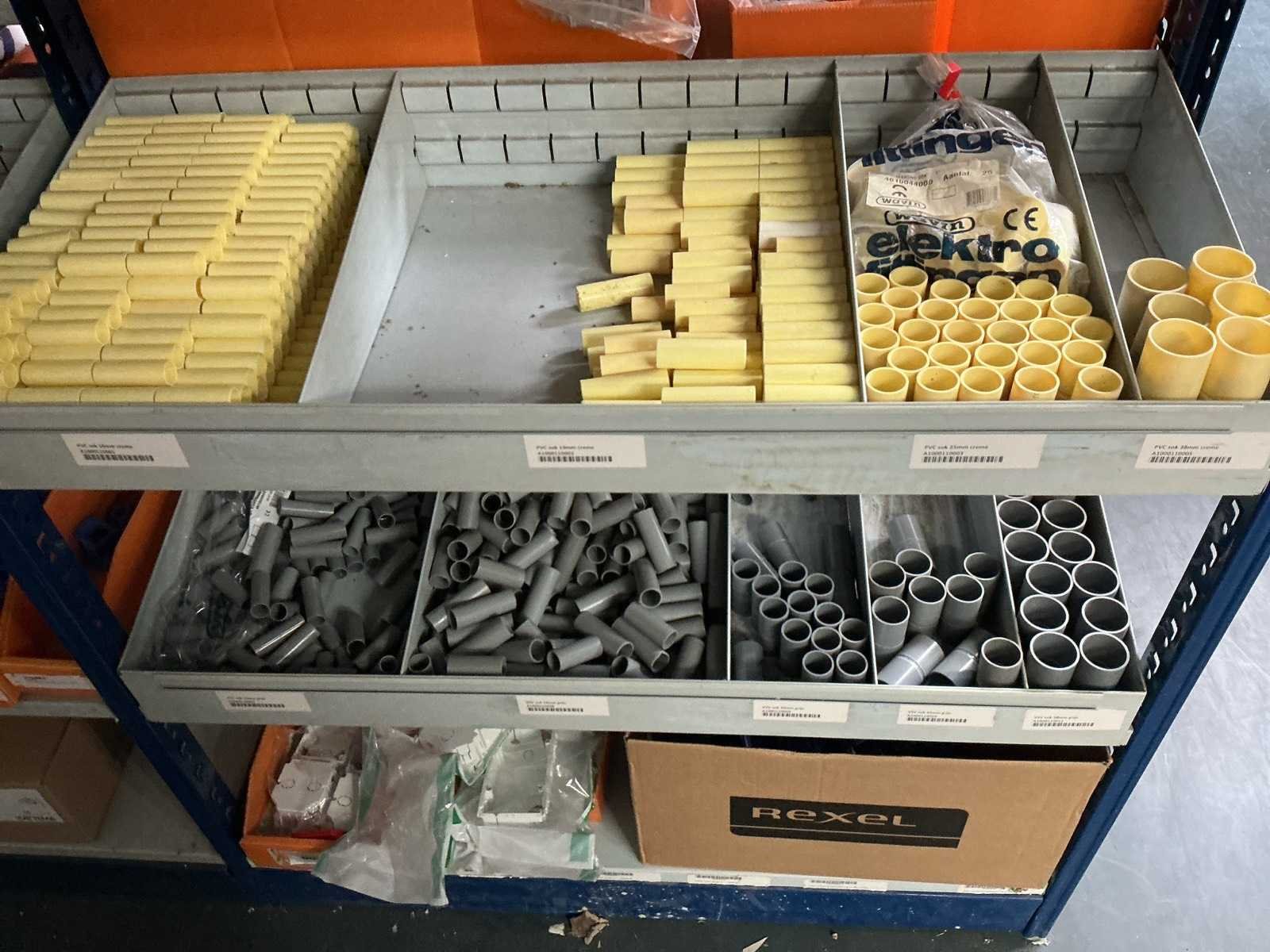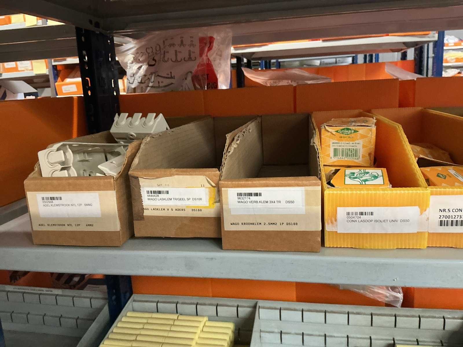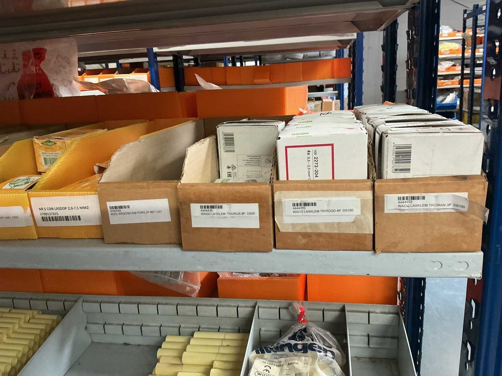 W.o. Kabelden, lasklemmen; pvc sokken uit 5 schappen van de stelling