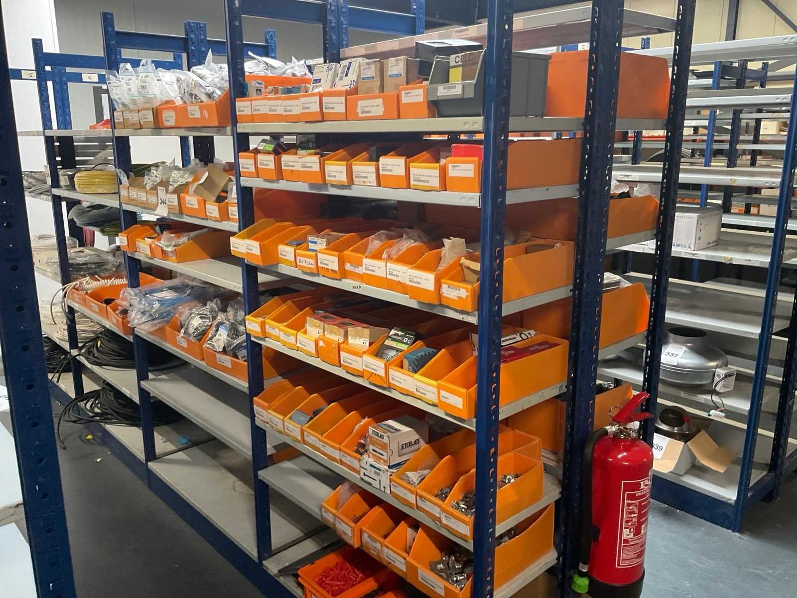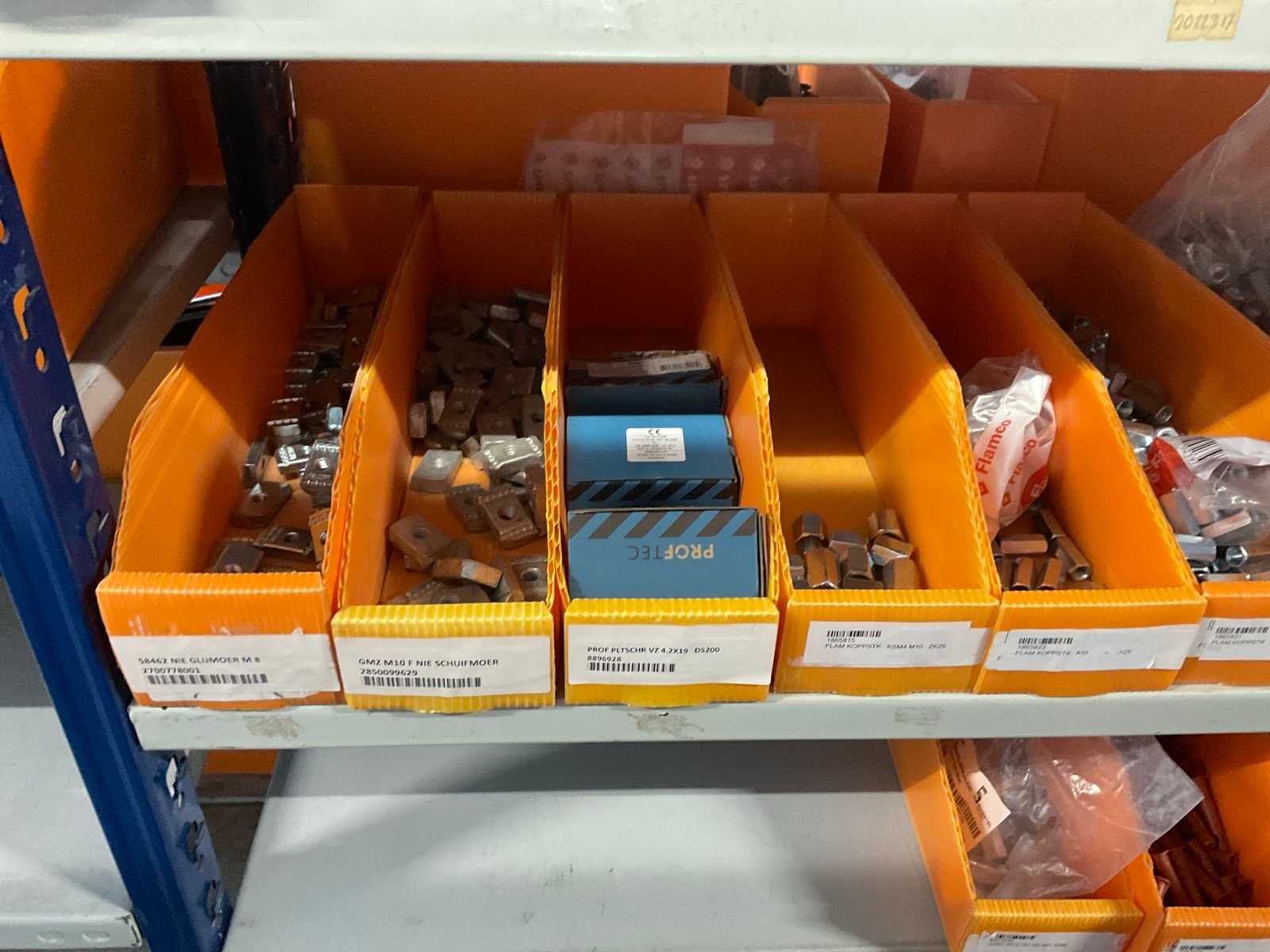 W.o. Schroeven; pluggen; moeren; stokeinden; koppelstukken; balkklemmen etc uit 7 schappen van de stelling