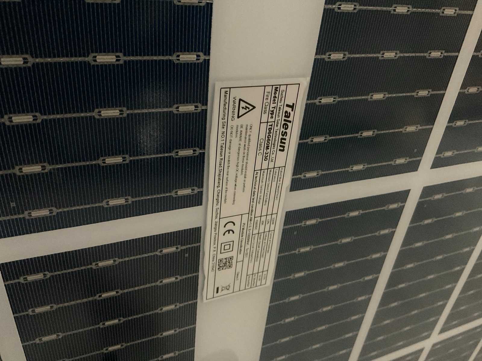 Merk: Talesun Type: TD6G60M-330 Max. dc power: 330W Totale afmeting L: 1705mm Totale afmeting Breedte: 1010mm