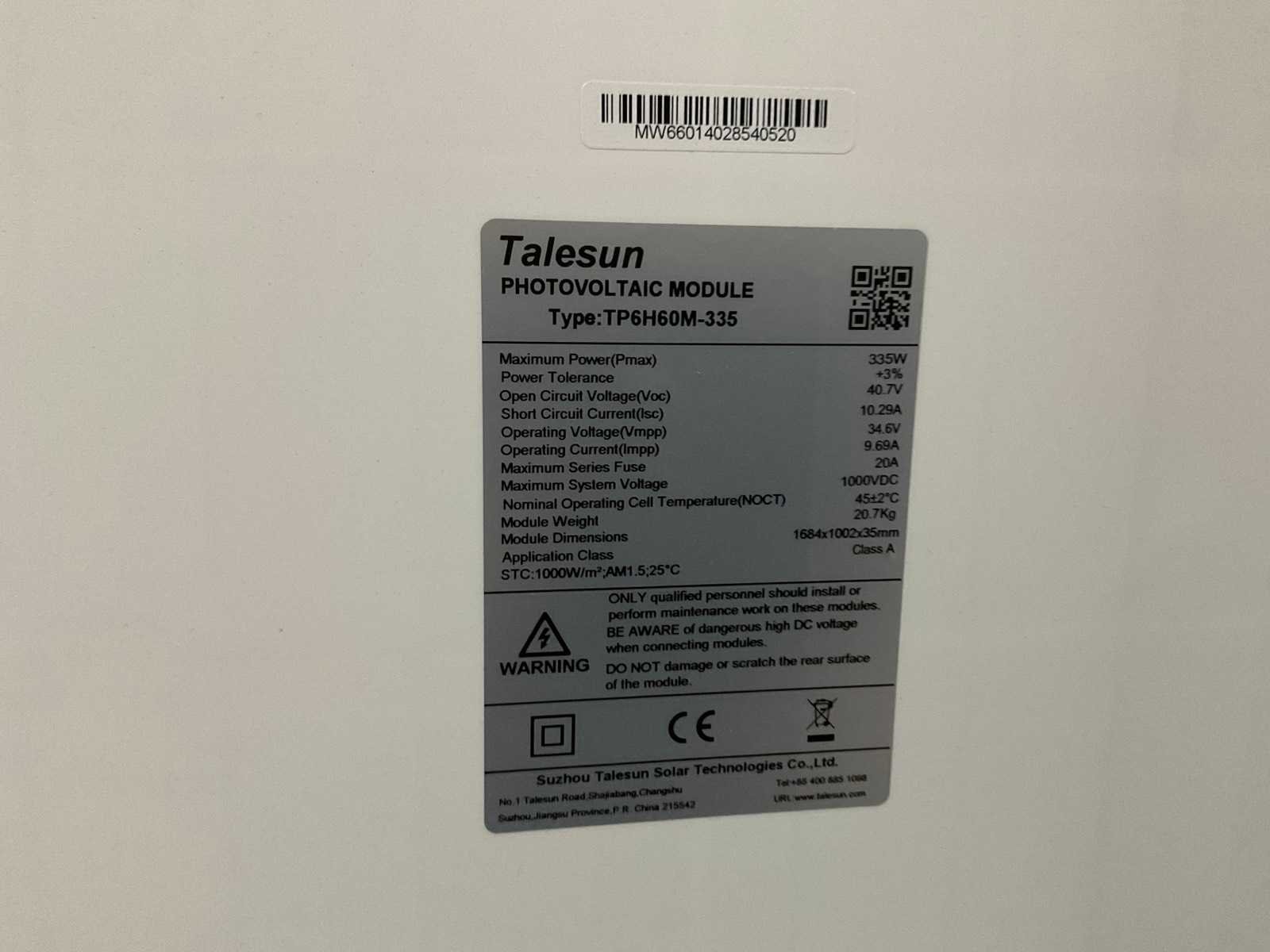 Merk: Talesun Type: TP6H60M-335 Max. dc power: 335W