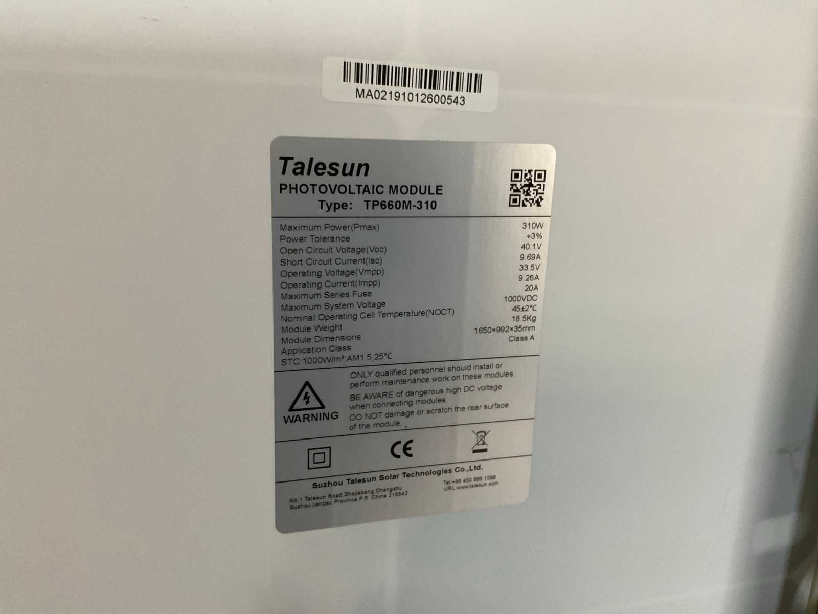 Merk: Talesun Type: TP660M-310 Max. dc power: 310W Totale afmeting L: 1650mm Totale afmeting Breedte: 992mm