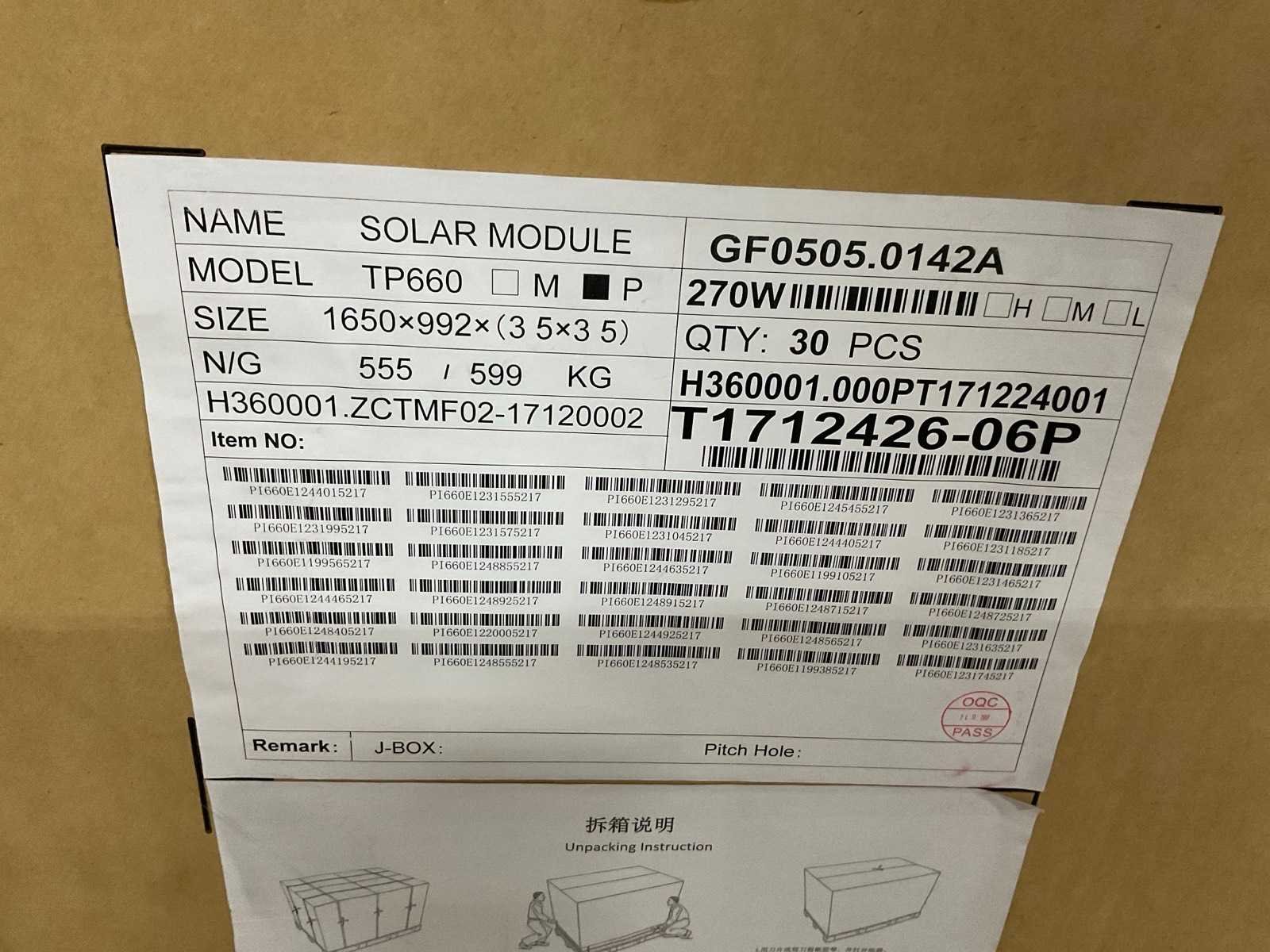 Zonder het stapeljuk Merk: Talesun Type: TP660P Max. dc power: 270W Totale afmeting L: 1650mm Totale afmeting Breedte: 992mm