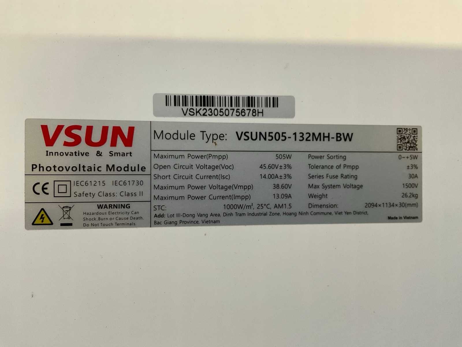Merk: Vsun Type: Vsun505-132HN-BW Max. dc power: 505W Totale afmeting L: 2094mm Totale afmeting Breedte: 1134mm