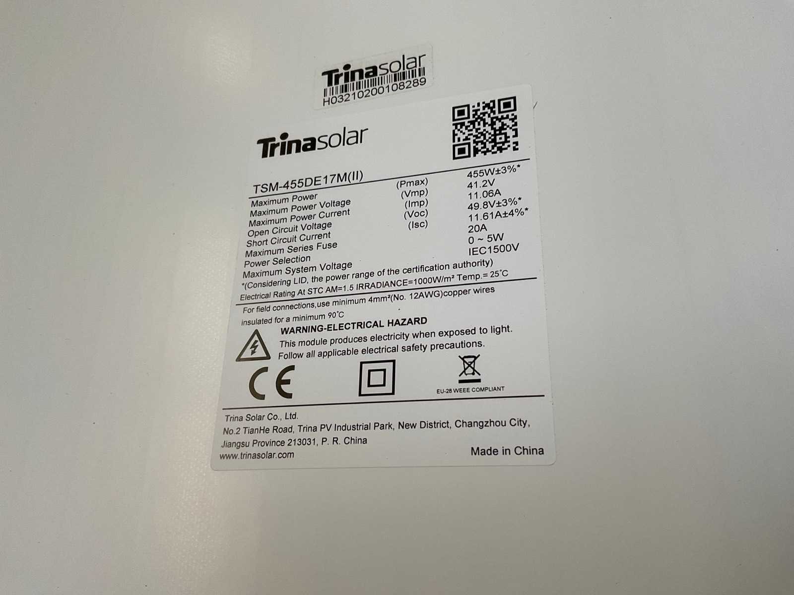 Merk: Trinasolar Type: TSM-455DE17M Max. dc power: 455W Totale afmeting L: 2100mm Totale afmeting Breedte: 1040mm