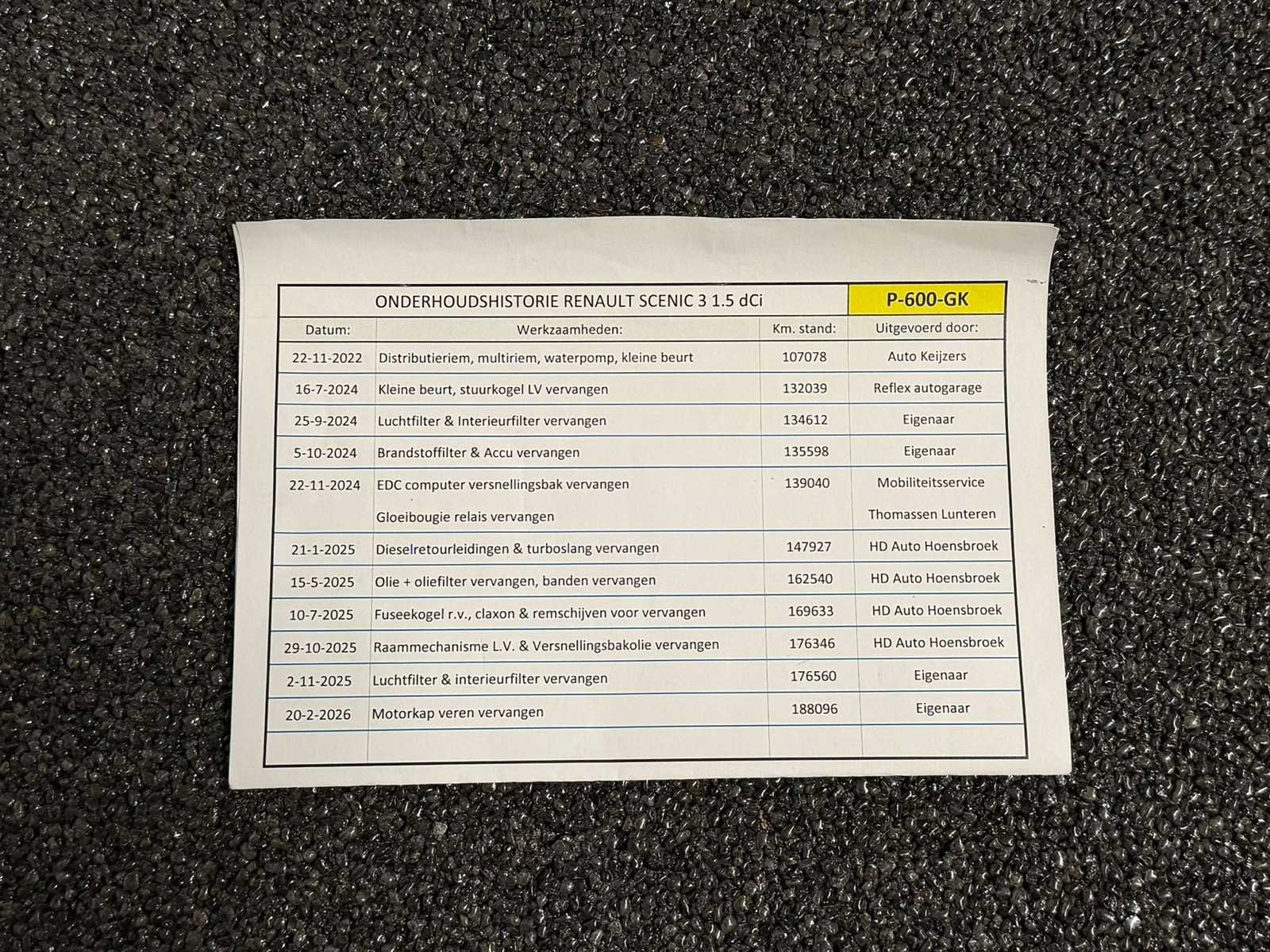 Kijkdag in overleg, stuur een email naar info@gcauctions.nl Renault Scénic 1.5 dCi Bose|TREKHAAK|PDC|HALF LEER|AUT|XENON Kenteken: P-600-GK Merk: Renault Model: Scénic Type: 1.5 dCi Bose Bouwjaar: 2015 Afgelezen kilometerstand: 190497km Cilinderinhoud: 1461cc Vermogen (kW): 81kW Brandstof: Diesel Chassisnummer: VF1JZS00E52822153 Datum eerste toelating: 2015-03-16 APK vervaldatum: 2026-08-07 Vermogen (pk): 110hp Aandrijving: Start en rijdt Aantal zitplaatsen: 5 Maximaal trekgewicht ongeremd: 1500kg Maximaal trekgewicht geremd: 750kg Kleur: grijs Transmissie: Semi-Automatisch (6) Emissieklasse: 5 Aantal deuren: 4 Aantal sleutels: 1 Ledig gewicht: 1405kg Bruto BPM (NL): 1871€ Aantal cilinders: 4 Carrosserie: MPV Carfax Link: https://was.carfax.eu/v0/api/ccdid/5100016408/svc/201/vinreg/P600GK/checksum/eyJhbGciOiJIUzI1NiIsInR5cCI6IkpXVCJ9.eyJleHAiOjE3Nzg5OTkwODR9.hcAZ0cVo4vd6QuuaayzCKdqICF0voKluC5P4m3grguU Start en rijdt: Start and drive startinformatie : Start en rijdt