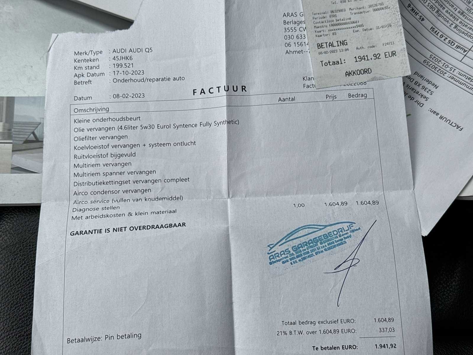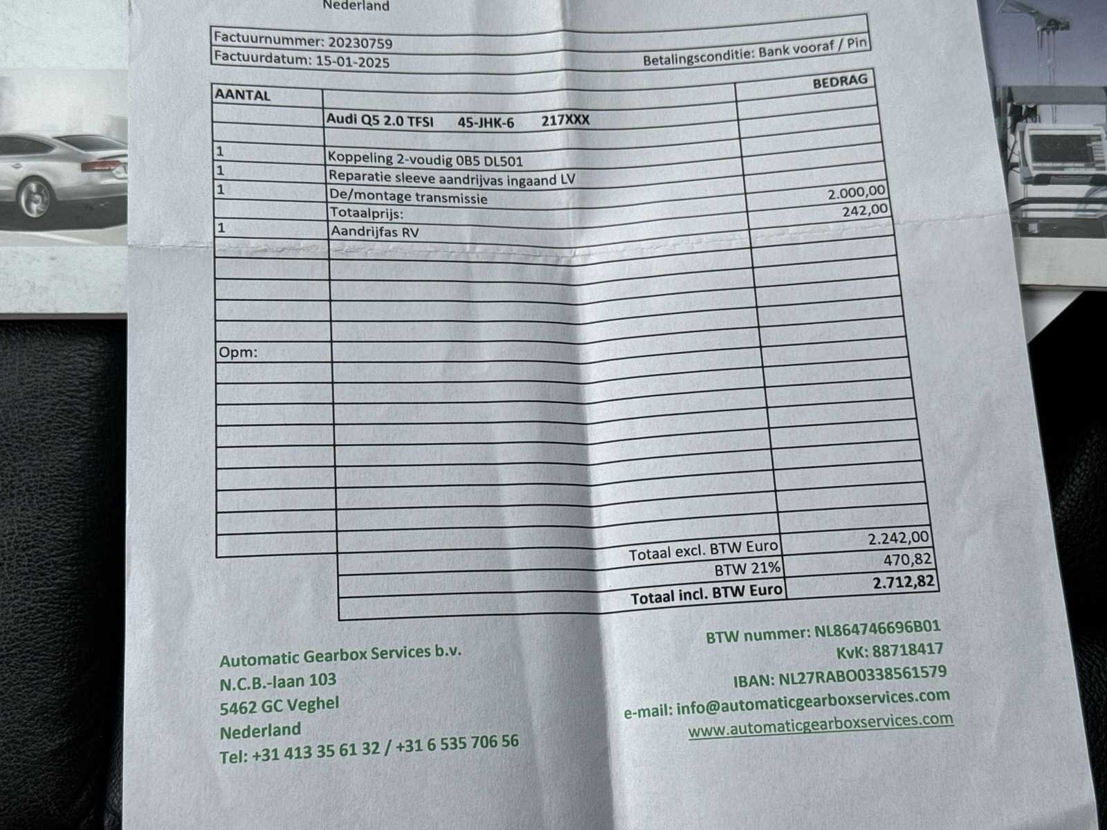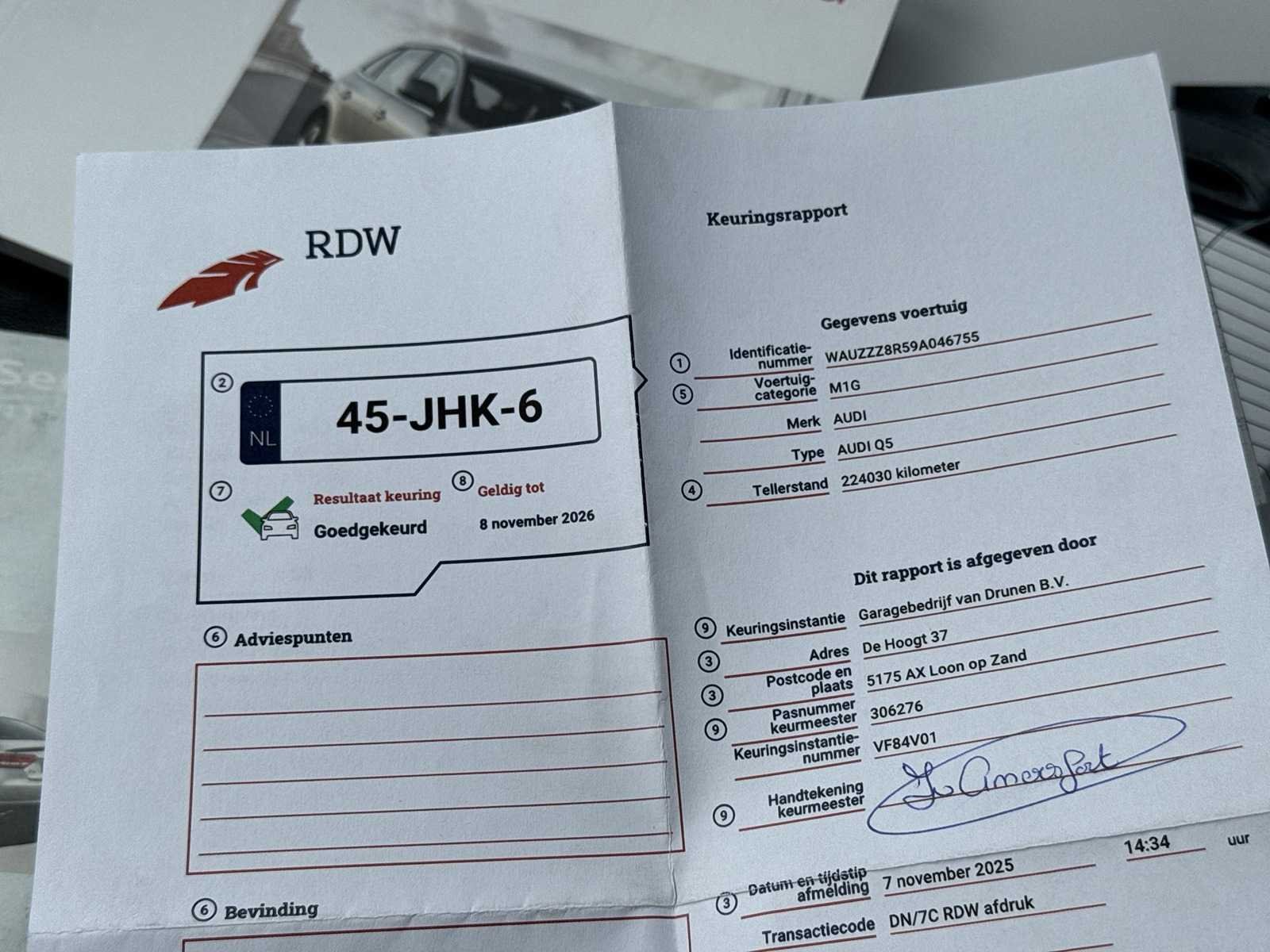| PANO | BTW AUTO | YOUNGTIMER | XENON | STOELVERWARMING | APK 08-11-2026 | DISTRIBUTIE + WATERPOMP VERVANGEN | APPLE CARPLAY / ANROID AUTO | ORIG. NL | Kenteken: 45-JHK-6 Merk: Audi Model: Q5 Type: 2.0 TFSI quattro Pro Line Bouwjaar: 2009 Afgelezen kilometerstand: 230524km Cilinderinhoud: 1984cc Vermogen (kW): 155kW Brandstof: Benzine Chassisnummer: WAUZZZ8R59A046755 NAP status: Logisch Datum eerste toelating: 2009-05-29 Datum eerste toelating (NL): 2009-05-29 APK vervaldatum: 2026-11-08 Vermogen (pk): 208hp Aandrijving: Start en rijdt Aantal zitplaatsen: 5 Maximaal trekgewicht ongeremd: 750kg Maximaal trekgewicht geremd: 2000kg Kleur: Grijs Transmissie: Automaat Emissieklasse: 5 Aantal deuren: 5 Aantal sleutels: 2 Ledig gewicht: 1715kg Bruto BPM (NL): 18199€ Aantal cilinders: 4 Carrosserie: SUV Nationaliteit documenten: Nederlands Onderhoudshistorie: Aanwezig danwel digitaal Carfax Link: https://was.carfax.eu/v0/api/ccdid/5100016408/svc/201/vinreg/45JHK6/checksum/eyJhbGciOiJIUzI1NiIsInR5cCI6IkpXVCJ9.eyJleHAiOjE3NzU5MDE0OTF9.oobe2V3eqfPyKpz5pZh0WEoArjBtiOLE8S_m90RfSgM Start en rijdt: Start and drive startinformatie : Start en rijdt Self drive export possible : true Airconditioning: true Navigatie: false Xenon verlichting: true LED-koplampen: false