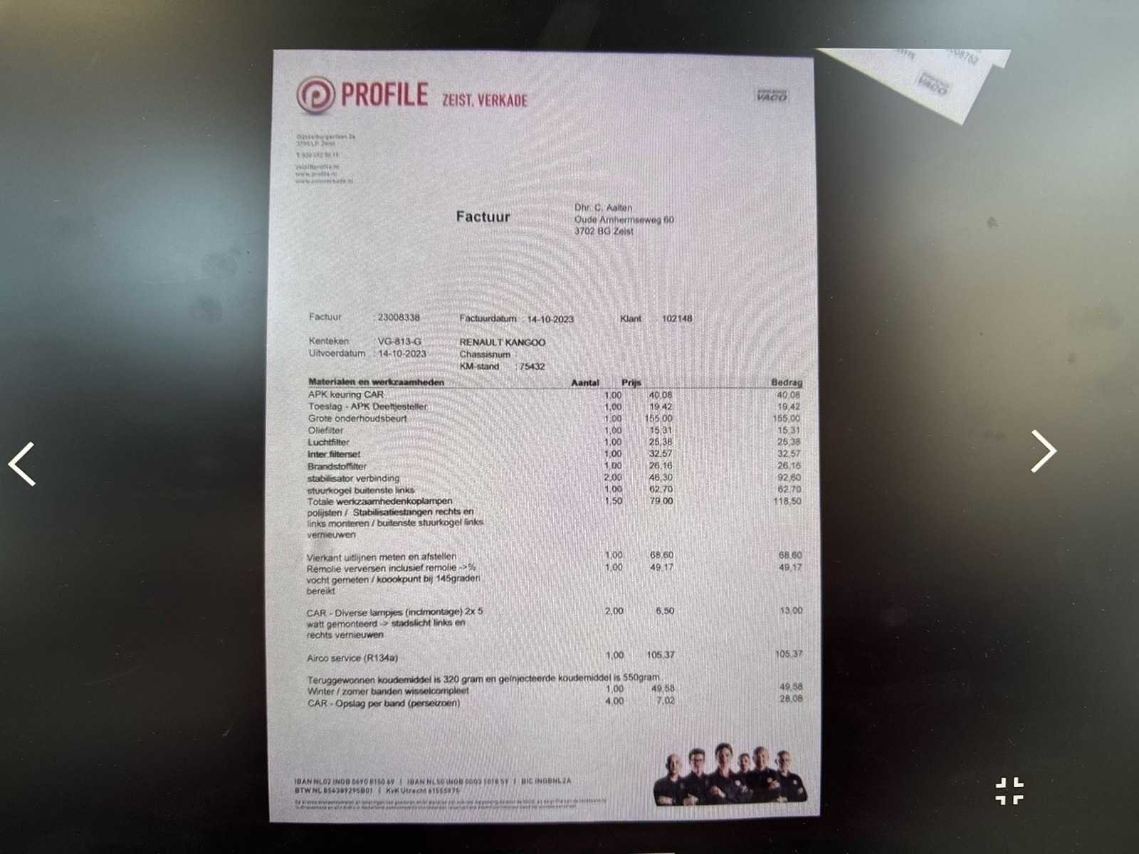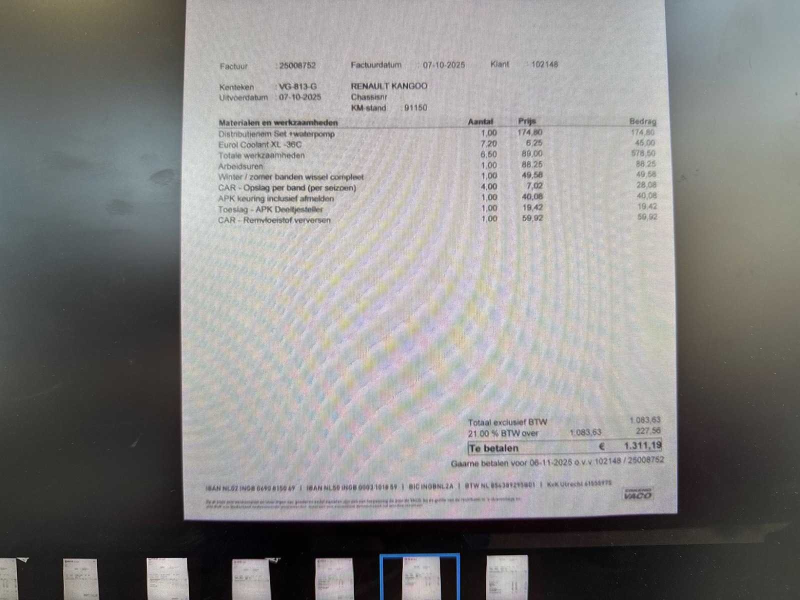 Kenteken: VG-813-G Merk: Renault Type: 1.5 dCi 110 Express Black Edition Model: Kangoo Express Bouwjaar: 2013 Chassisnummer: VF1FW16B649744427 Afgelezen kilometerstand: 92813km Cilinderinhoud: 1461cc Vermogen (kW): 81kW Brandstof: Diesel Datum eerste toelating: 2013-11-23 Datum eerste toelating (NL): 2013-11-23 APK vervaldatum: 2026-11-23 NAP status: Logisch Aandrijving: Start en rijdt Transmissie: Handgeschakeld Aantal zitplaatsen: 2 Stuurwiel: Linksgestuurd Bruto BPM (NL): 6890 Aantal sleutels: 1 Ledig gewicht: 1371kg Laadvermogen: 579kg Vermogen (pk): 109 Aantal cilinders: 4 Carrosserie: Gesloten opbouw Emissieklasse: 5 Onderhoudshistorie: Ja, aanwezig, danwel digitaal Startinformatie: Start en rijdt Maximaal trekgewicht geremd: 680