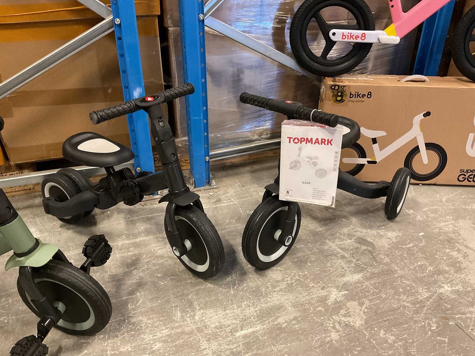 3x loopfiets/driewieler van Topmark (zwart, groen) 1x loopfiets van Bike 8 (roze) Merk: Topmark, Bike 8