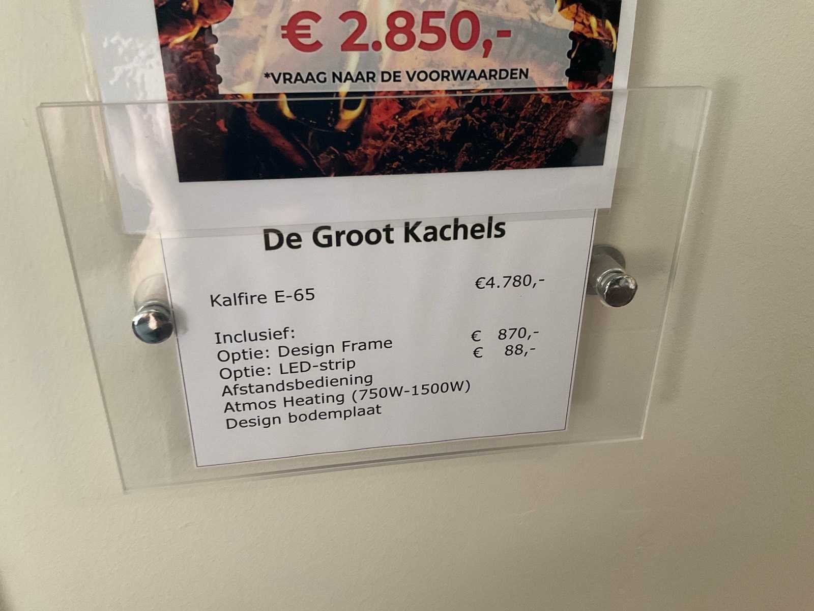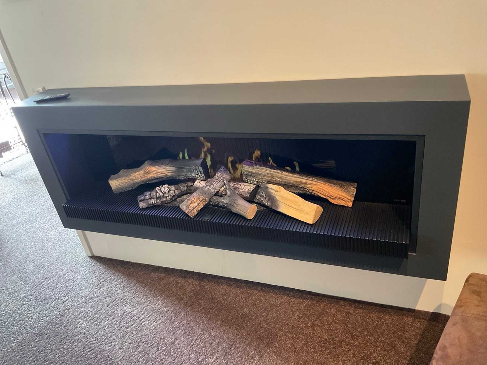Afm. Haard zicht 1670x280x630 mm; met houtstammenset en afstandsbediening; LET OP: haard door koper zelf ter plaatse te demonteren; wanden reeds gedemonteerd. Merk: Kallfire Model: E65