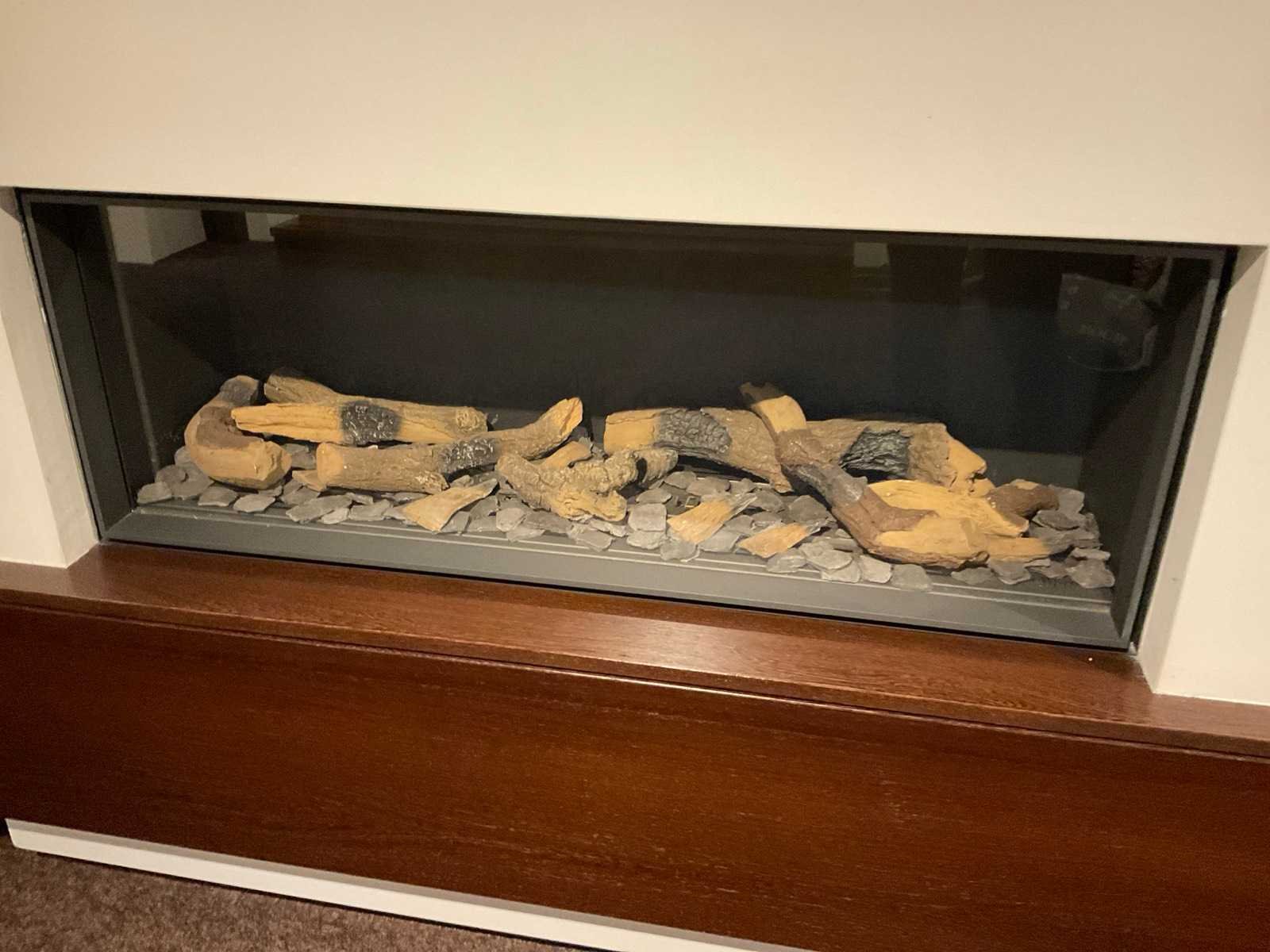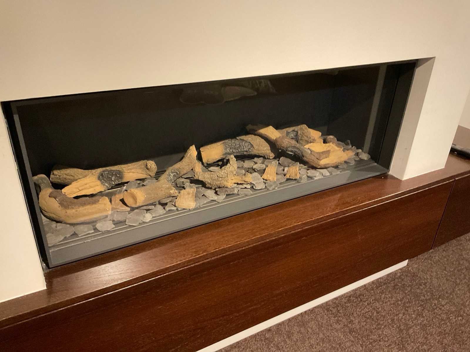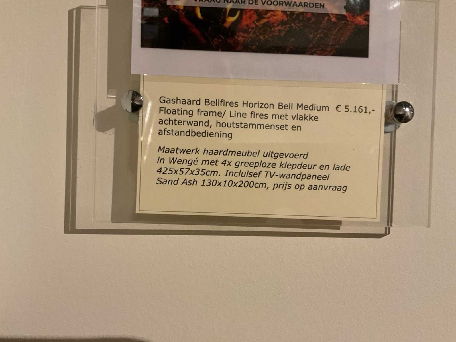 Met houtstammenset en afstandbediening; zwevende kast wengé gefineerd; afm. 425x57x35 cm; met klepdeuren; TV wandpaneel; afm. 102x200x11 cm en Samsung TV; LET OP: haard door koper zelf ter plaatse te demonteren; wanden reeds gedemonteerd; lift aanwezig Merk: Bellfires Model: Horizon Bell medium Lengte: 113 Hoogte: 42
