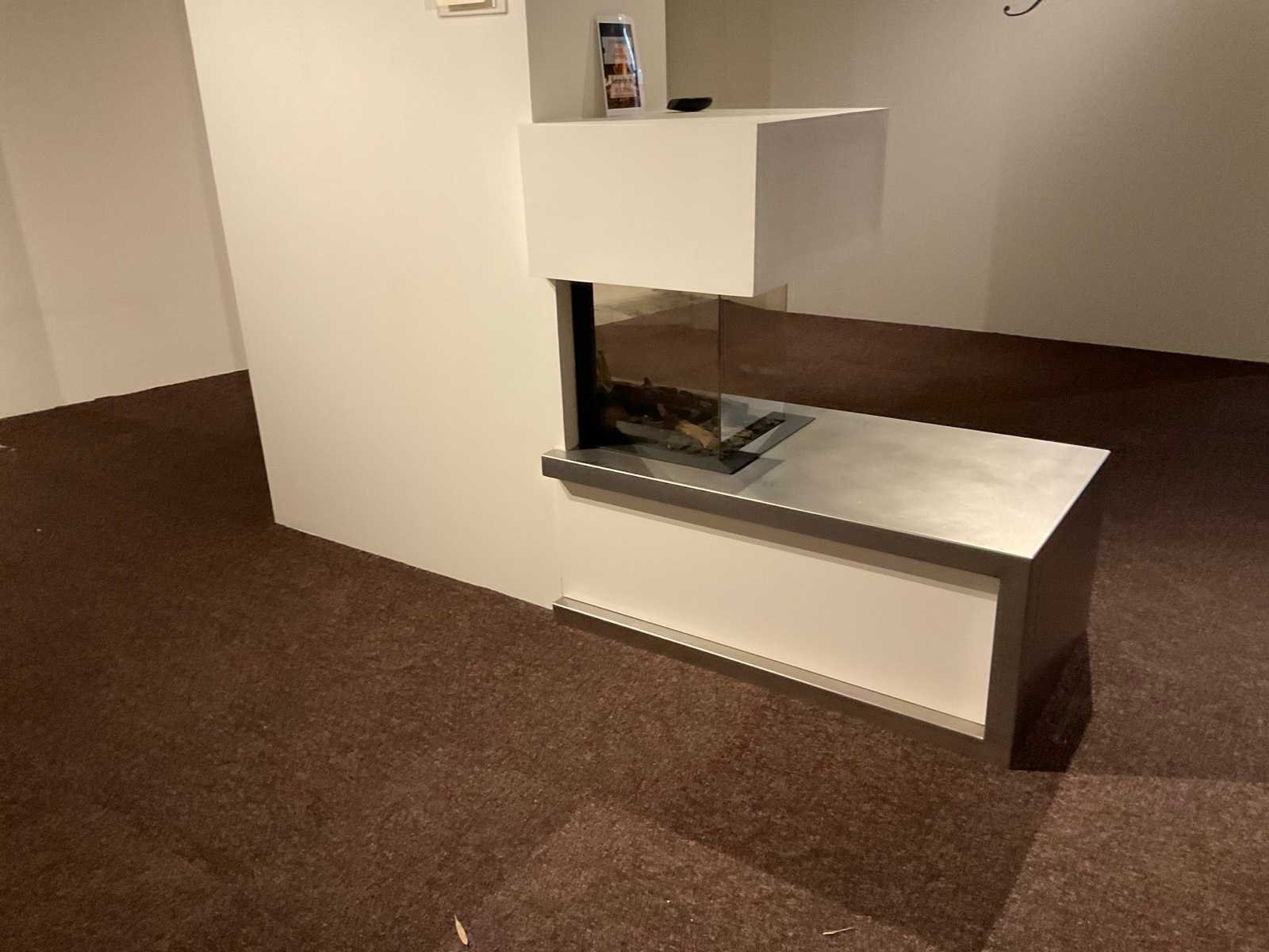 Met houtstammenset set en afstandsbediening; afm. haard zicht 102x43x41 cm; afm. RVS onderbouw 183x63x45 cm met schuifdeurkast hoogglans wit; LET OP: haard door koper zelf ter plaatse te demonteren; wanden reeds gedemonteerd ; lift aanwezig Merk: Dru Model: Metro 100 XTL