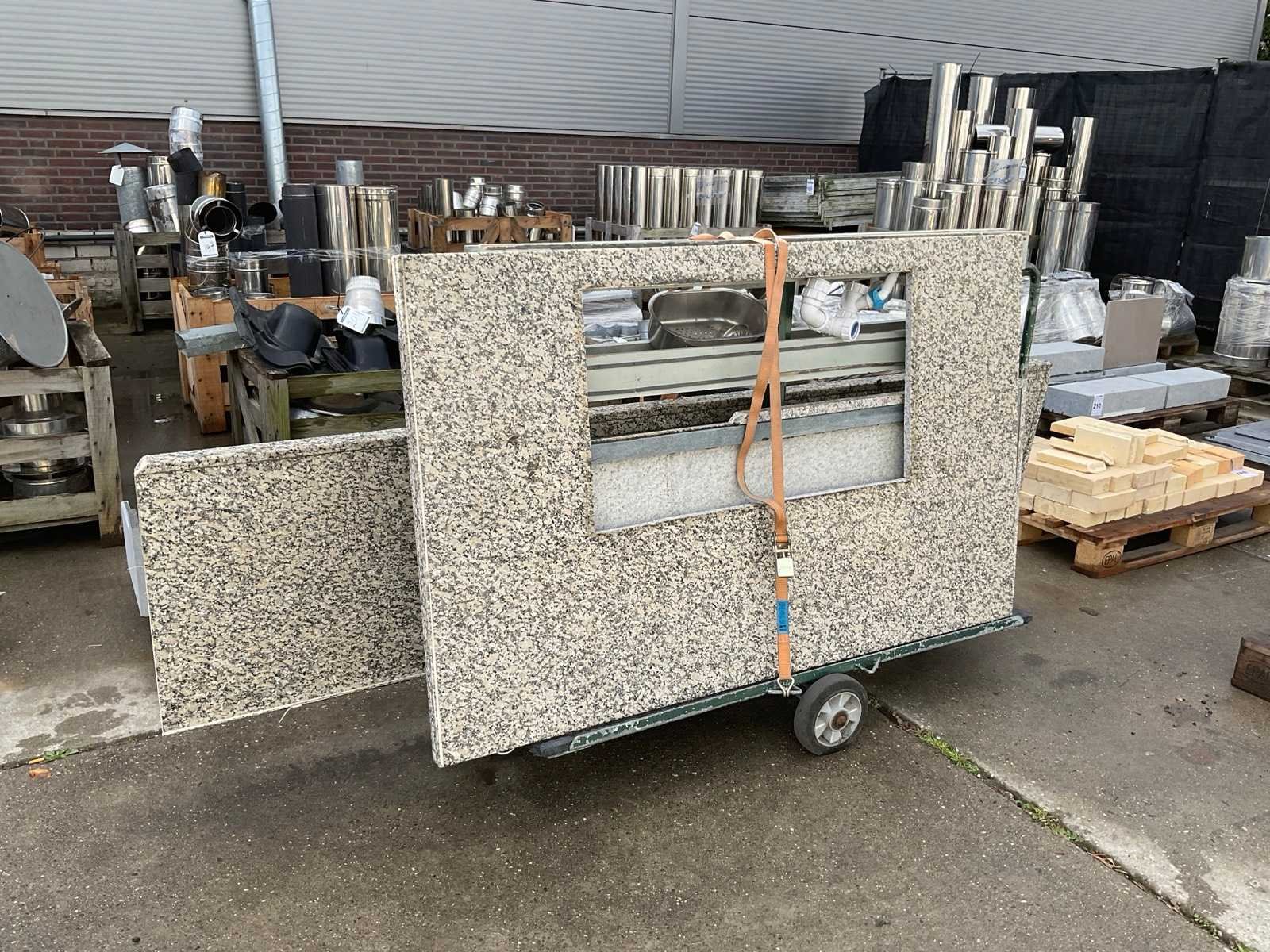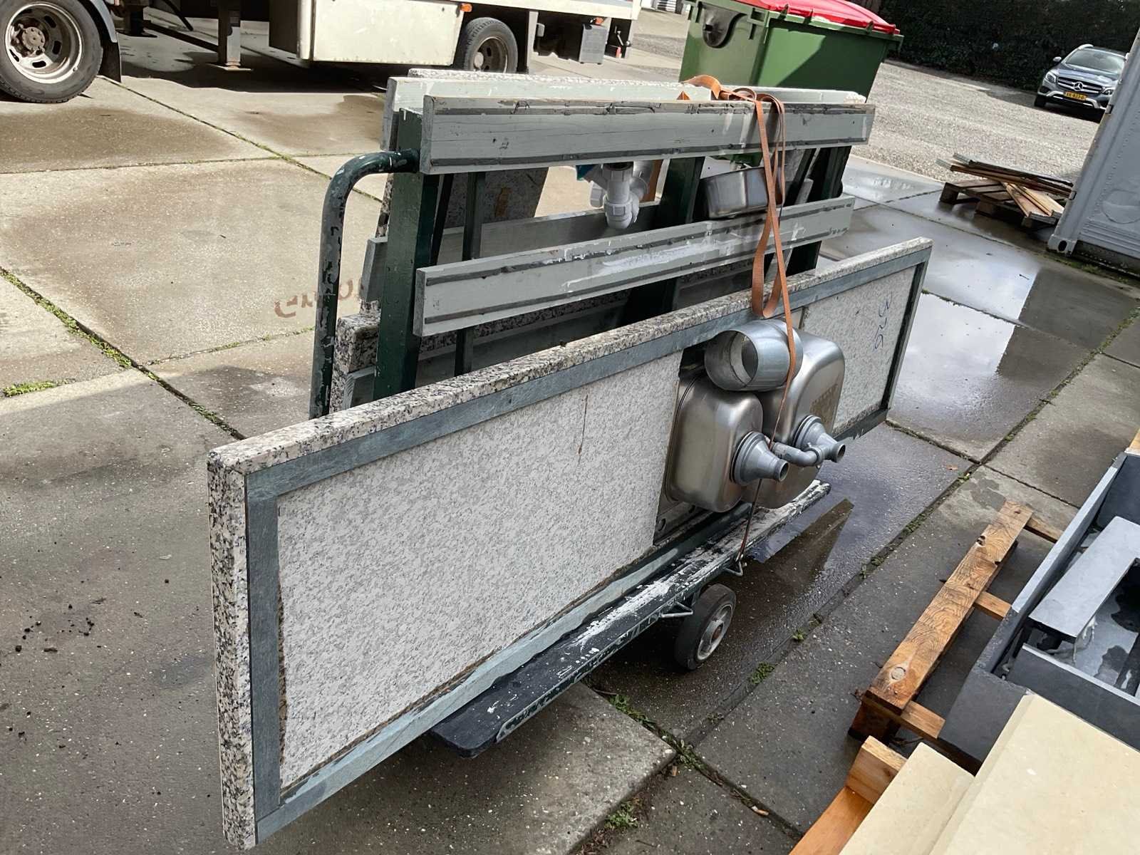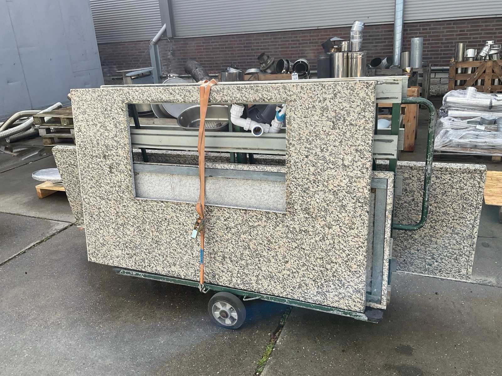 En Eilandwerkblad afm. 158x99 cm; met 3 kookelememten; spoelbak met inzet; met de transportwagen Lengte: 307cm Breedte: 150cm