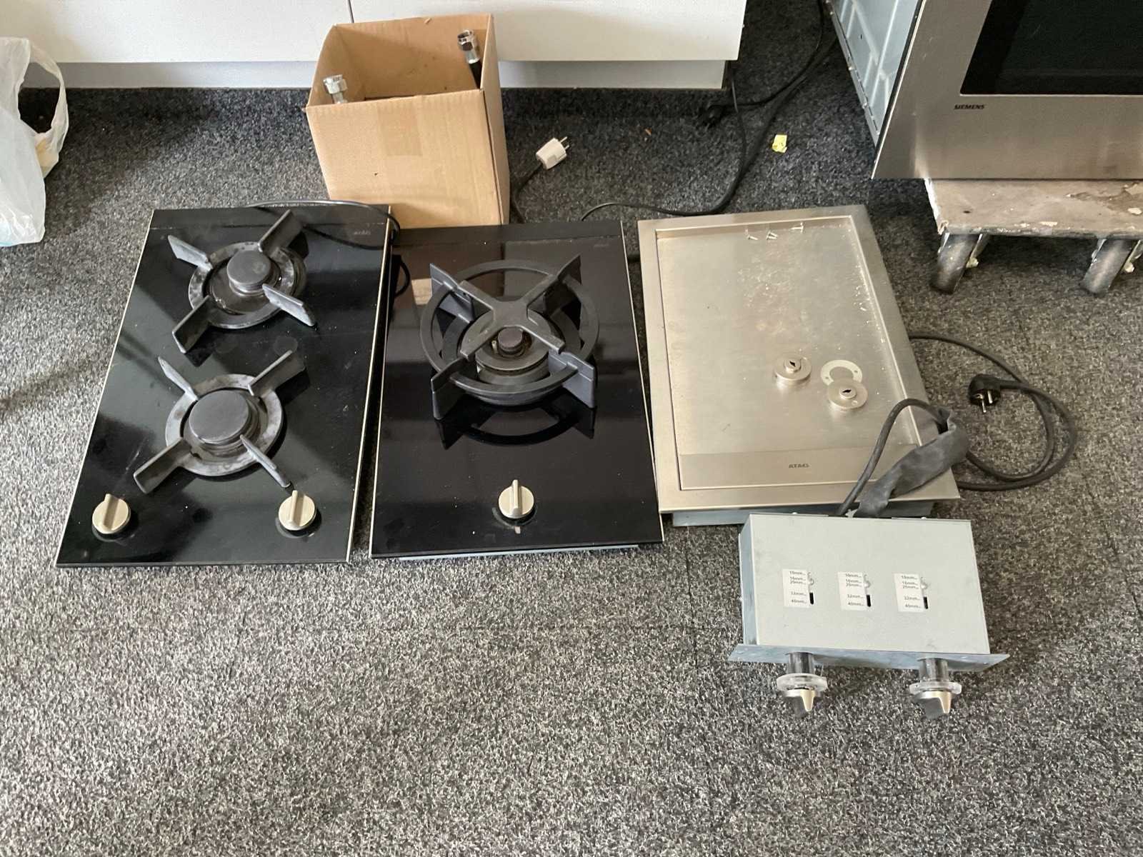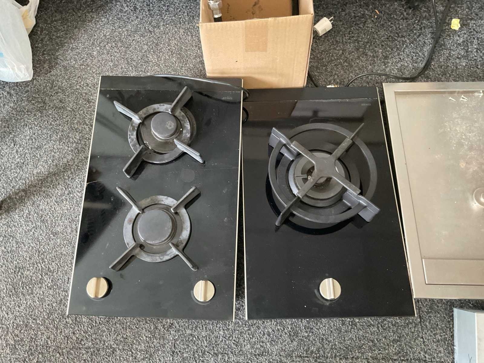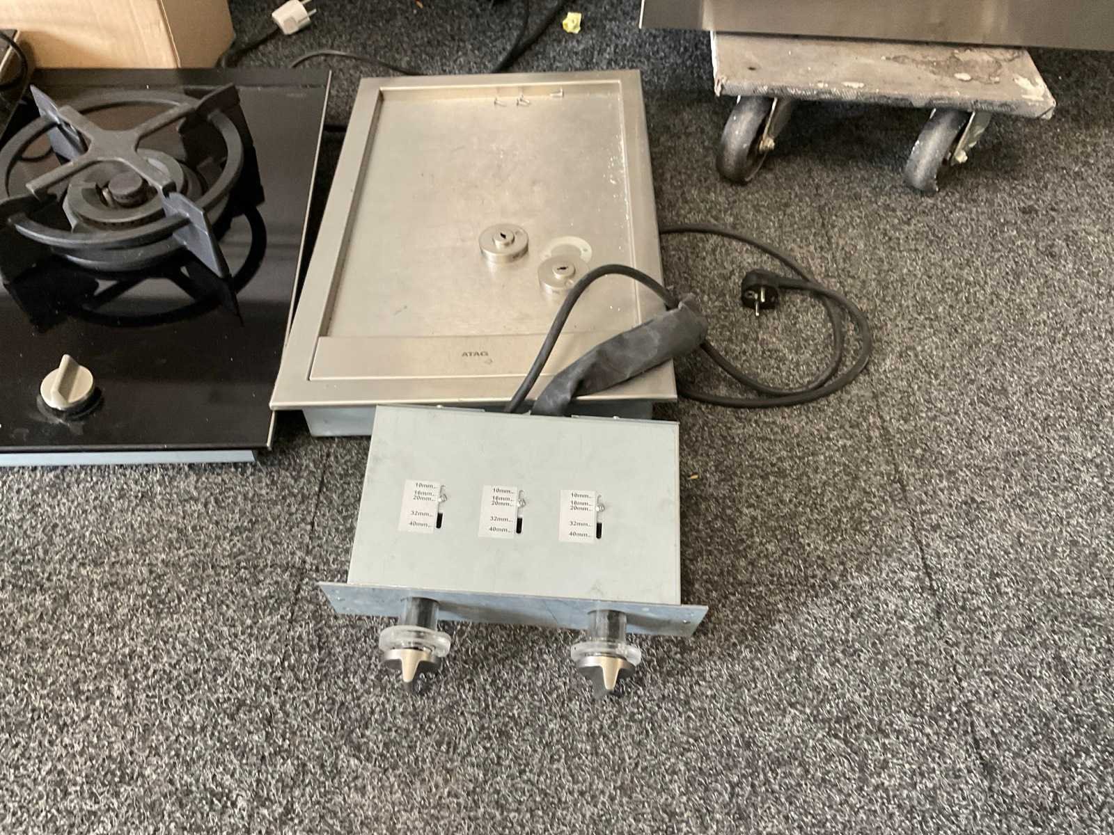 En Eilandwerkblad afm. 158x99 cm; met 3 kookelememten; spoelbak met inzet; met de transportwagen Lengte: 307cm Breedte: 150cm