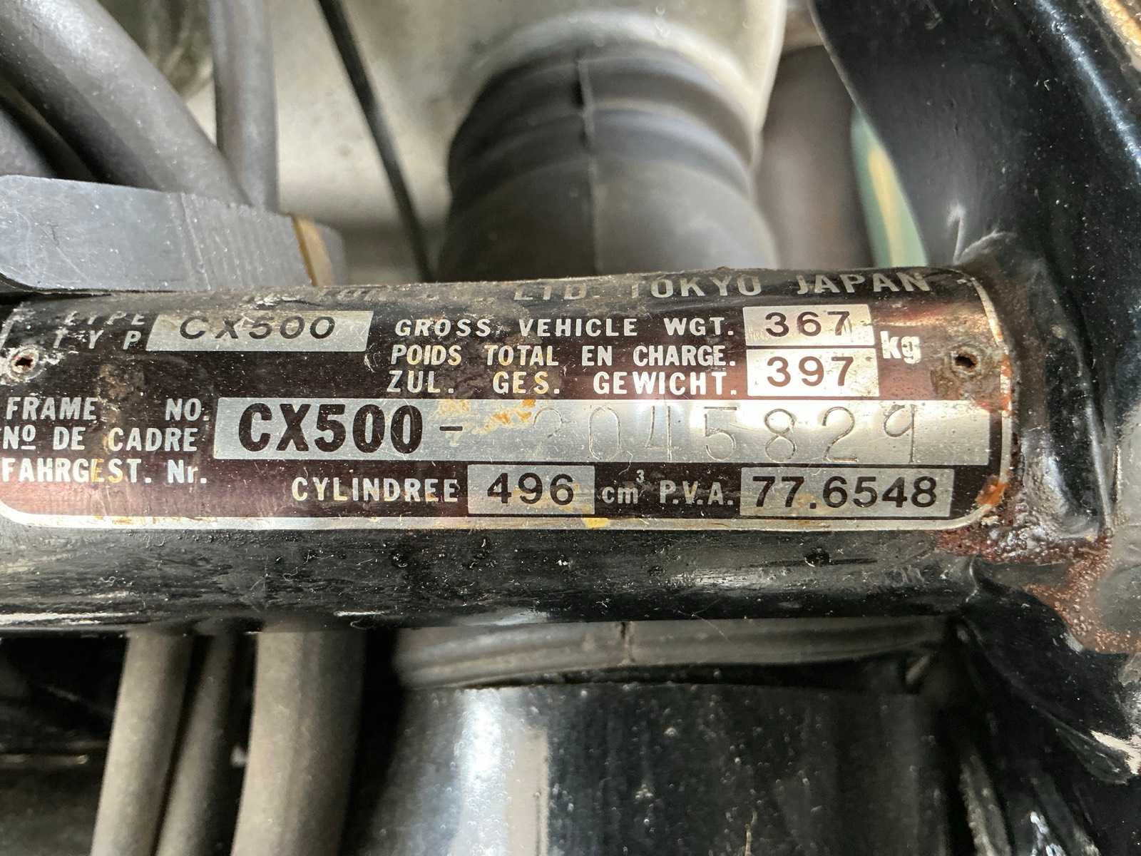 Merk: Honda Model: Tour Type: CX 500 E/500 Kenteken: MB-30-LF Brandstof: Benzine Chassisnummer: CX5002045829 Cilinderinhoud: 496cc Datum eerste toelating: 1980-04-29 Vermogen (kW): 37kW Kleur: niet van toepassing Afgelezen kilometerstand: 29110km Transmissie: Handgeschakeld (5) Bruto BPM (NL): 0€ Rest BPM: 0€ Bouwjaar: 1980