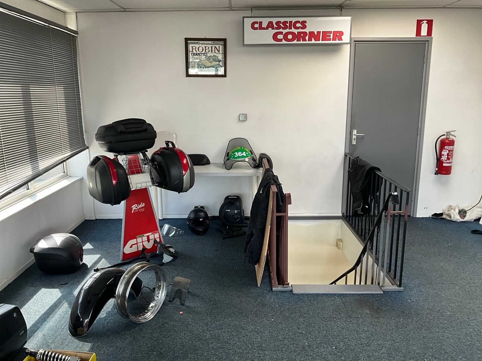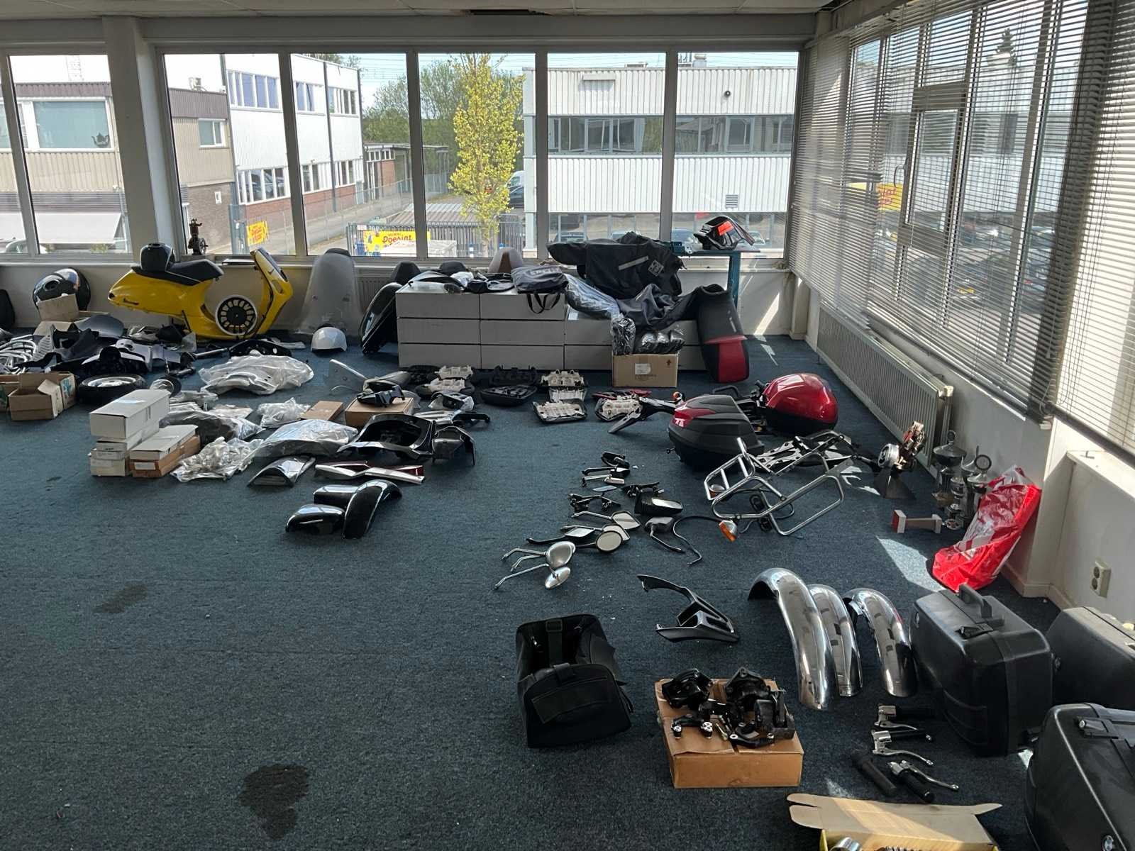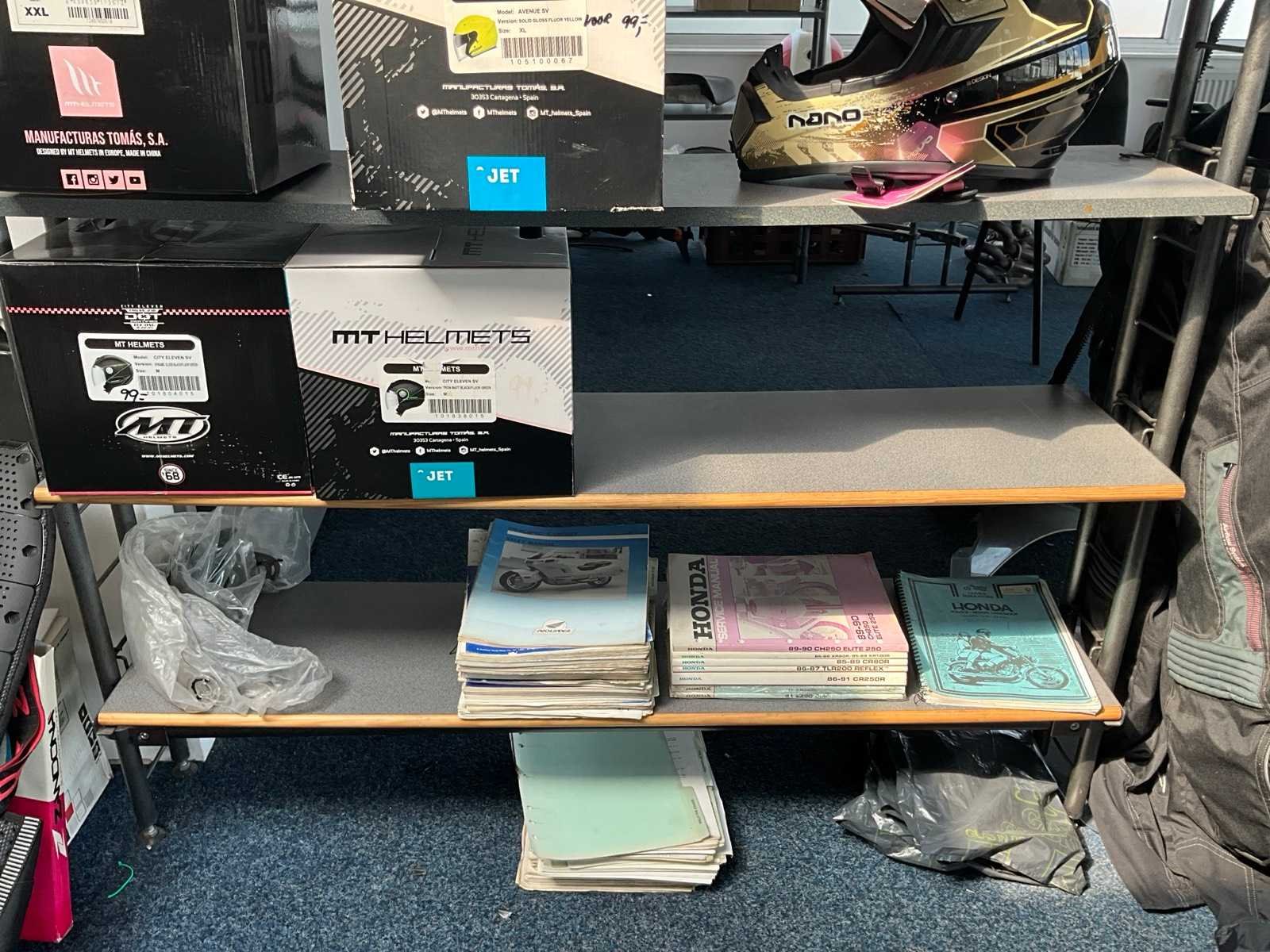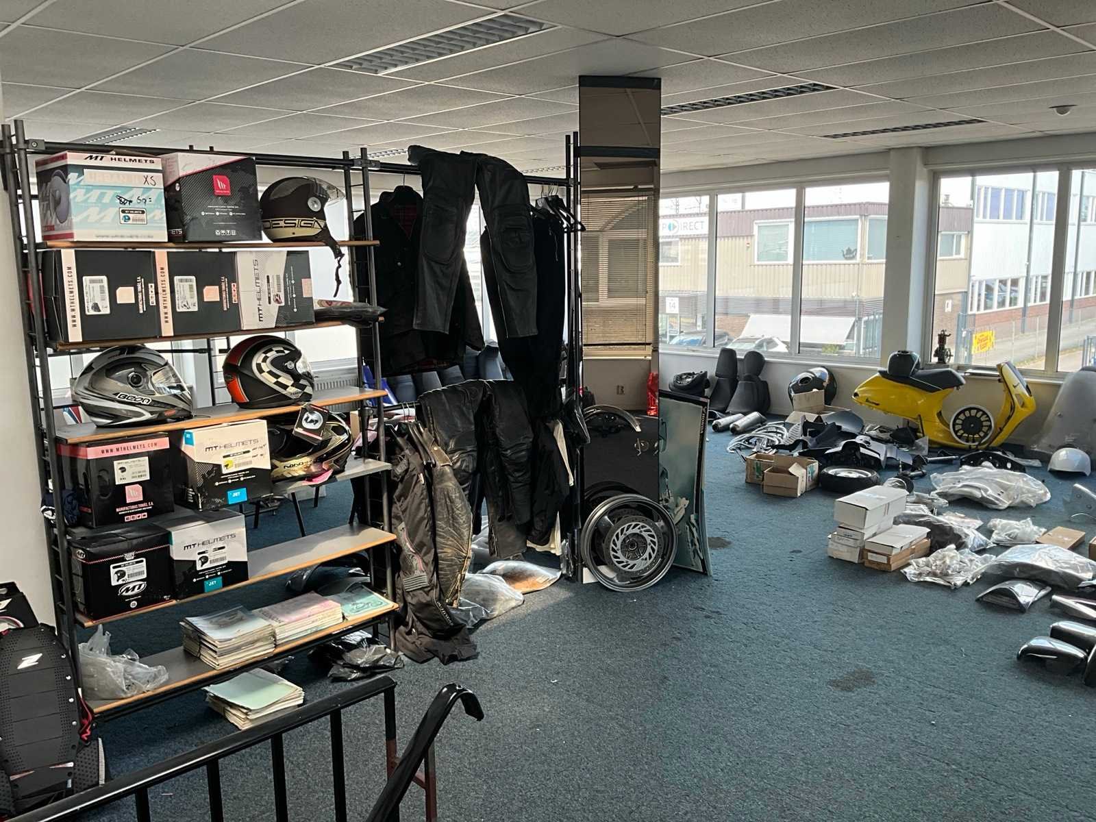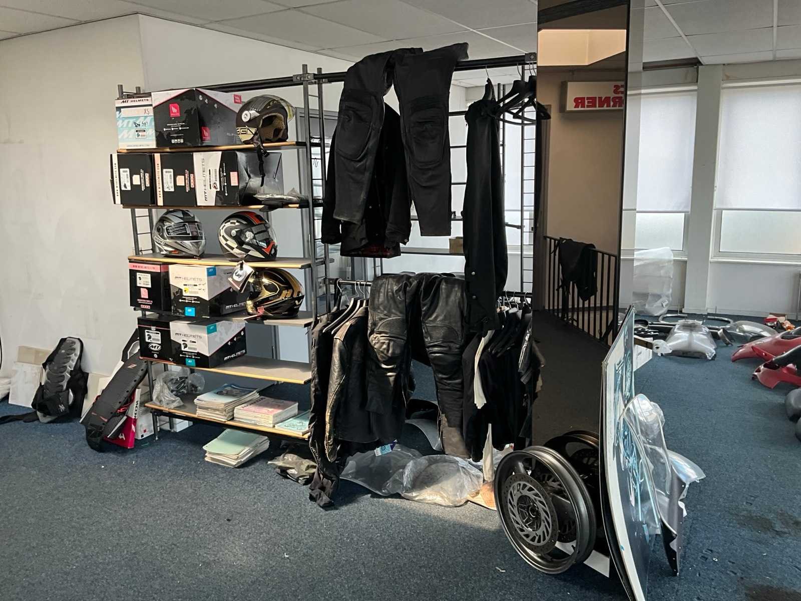 Betreft de inhoud van de verdieping; bestaande uit onder andere: motorzadels, kappen, uitlaten / collectoren, spiegels, koffers, Triumph benzinetank, motorkleding, MT Helmets motorhelmen (urban design, FU401SV ATOM SV, Le Mans 2 SV, Avenue SV), wanddecoratie, stellingen