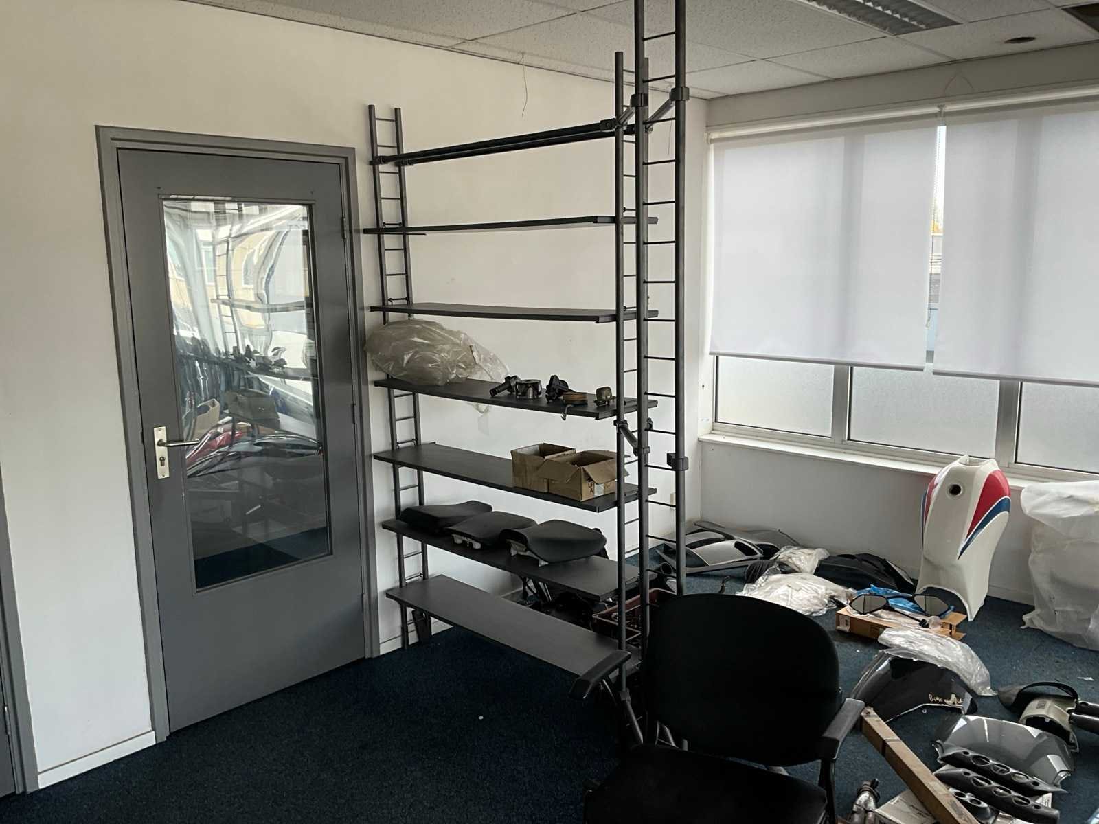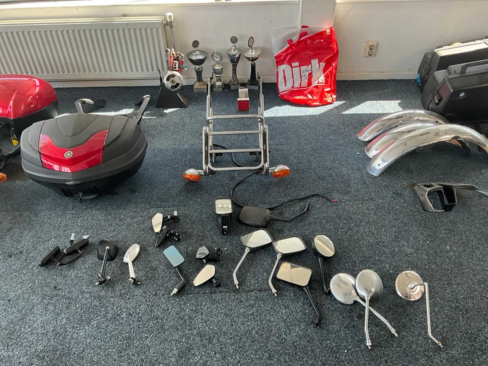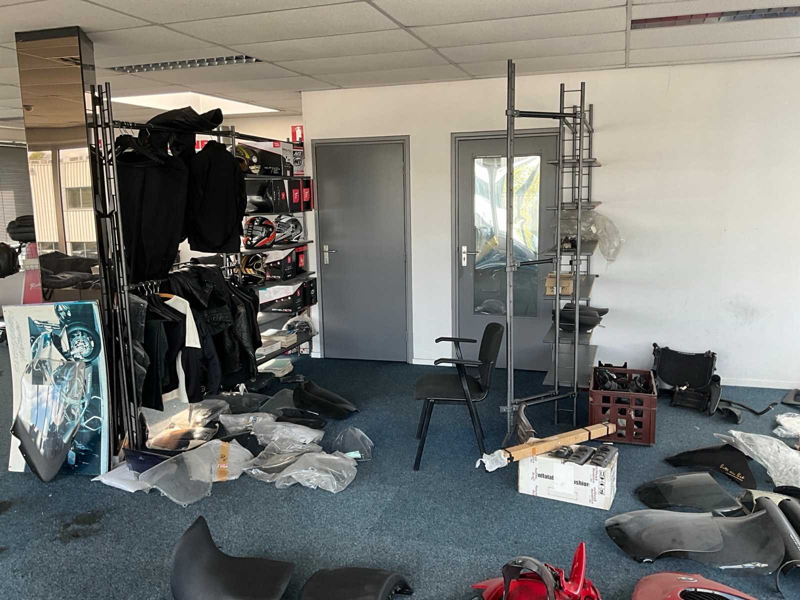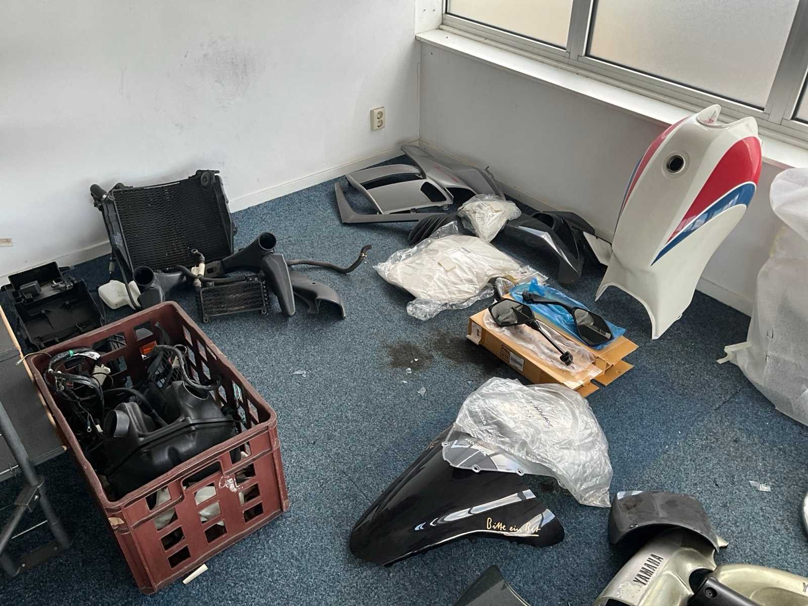 Betreft de inhoud van de verdieping; bestaande uit onder andere: motorzadels, kappen, uitlaten / collectoren, spiegels, koffers, Triumph benzinetank, motorkleding, MT Helmets motorhelmen (urban design, FU401SV ATOM SV, Le Mans 2 SV, Avenue SV), wanddecoratie, stellingen