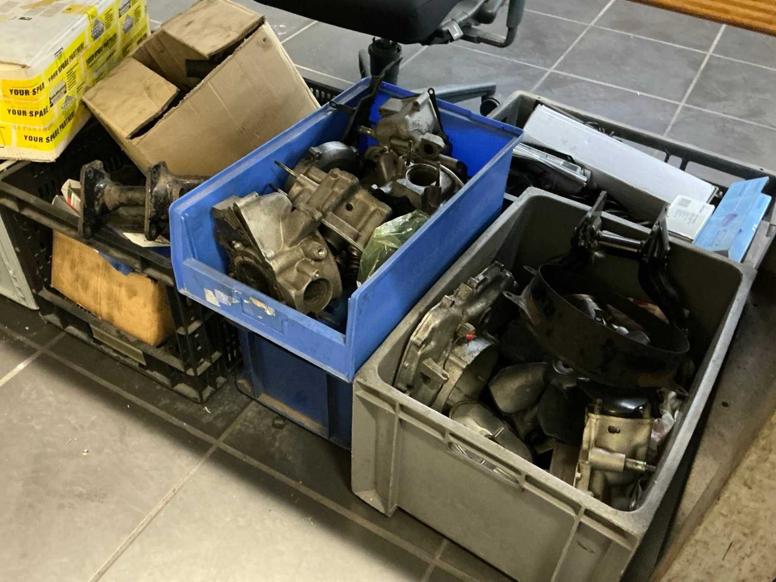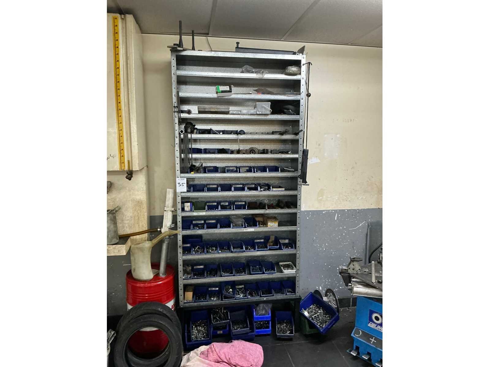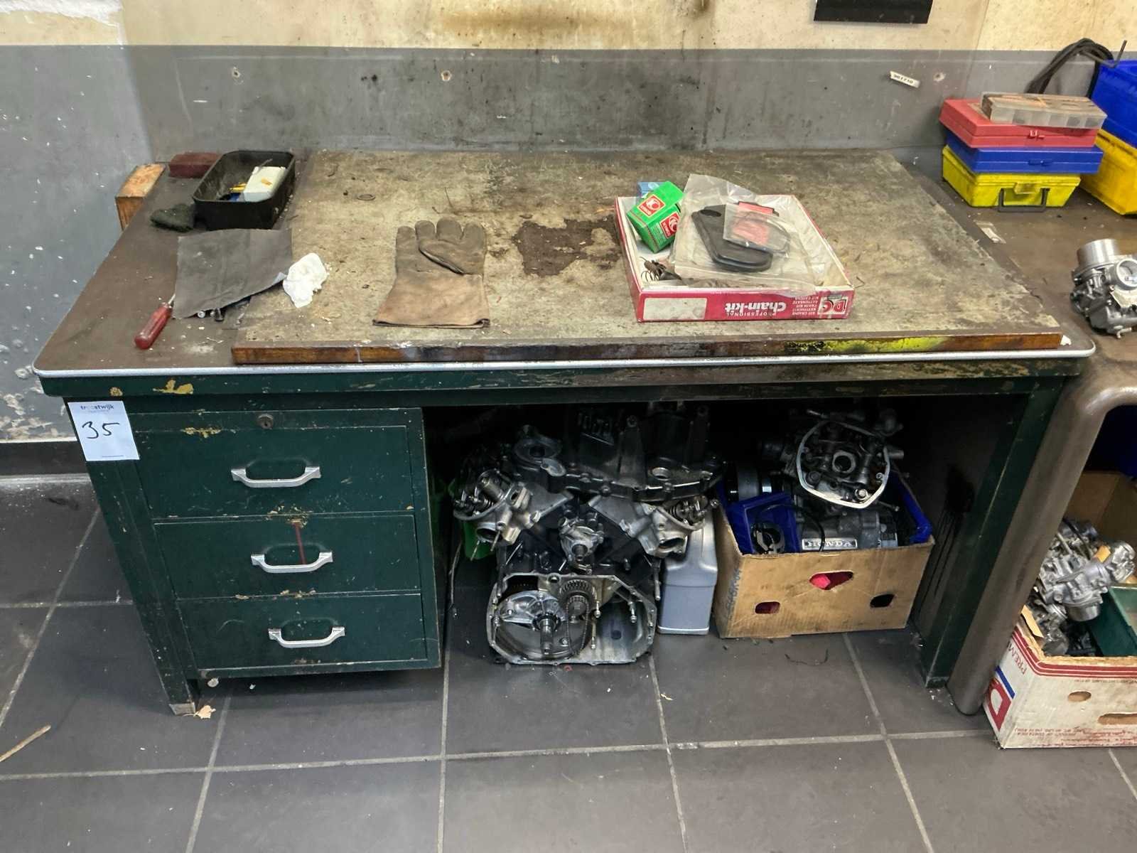 Bestaande uit: werktafels, diverse onderdelen / deels gereviseerde motorblokken, gereedschapswagen, verkoopbalie en grijpvoorraad bouten in / met stalen kast