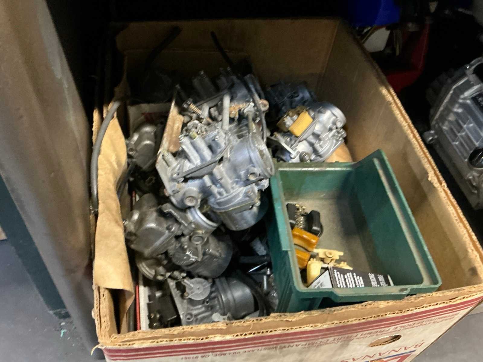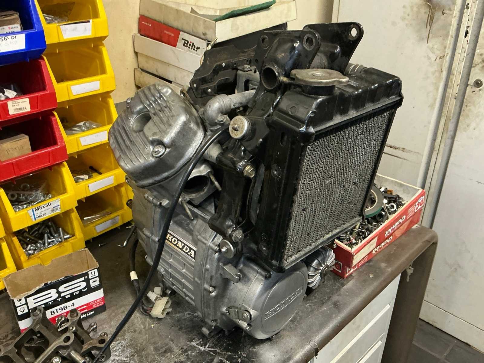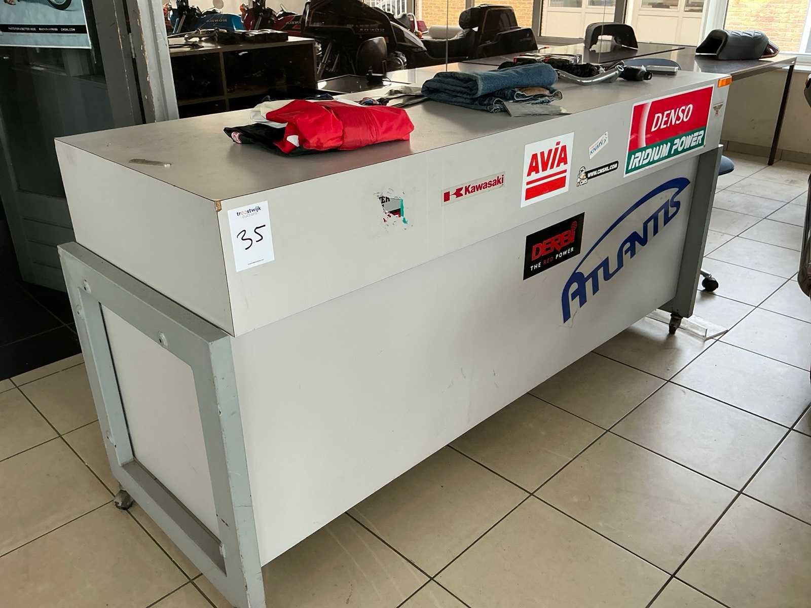 Bestaande uit: werktafels, diverse onderdelen / deels gereviseerde motorblokken, gereedschapswagen, verkoopbalie en grijpvoorraad bouten in / met stalen kast