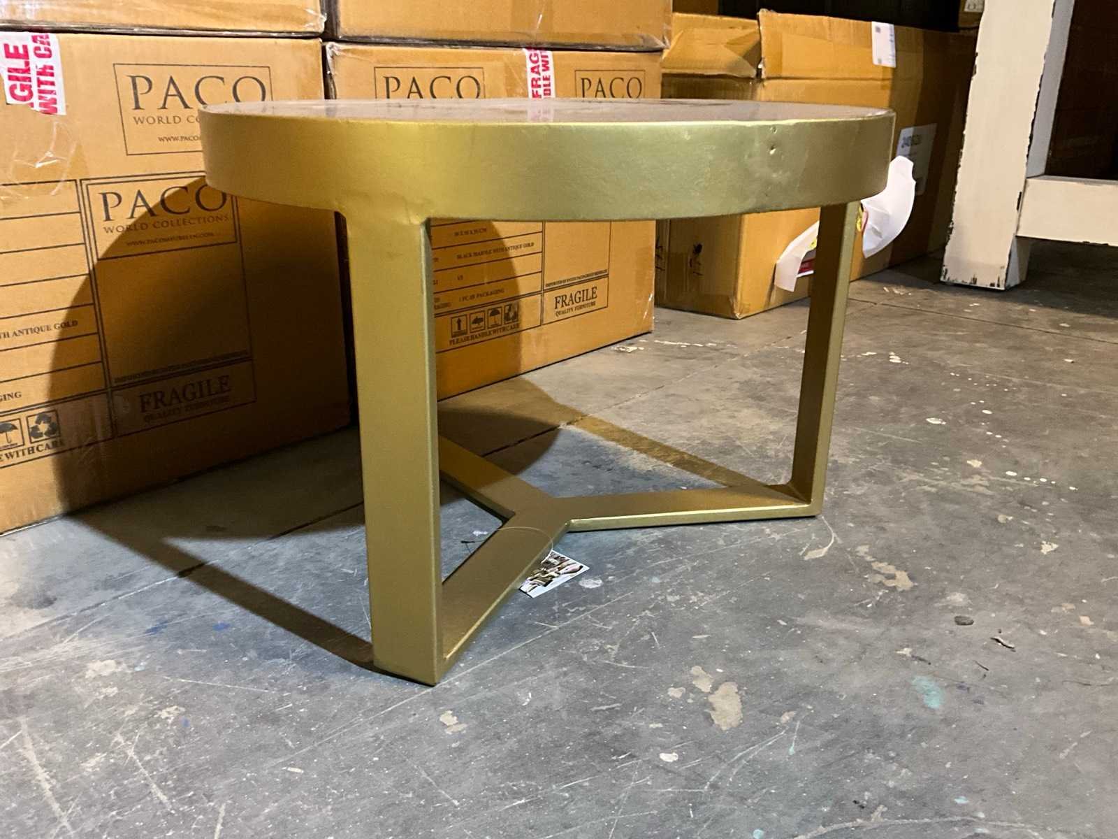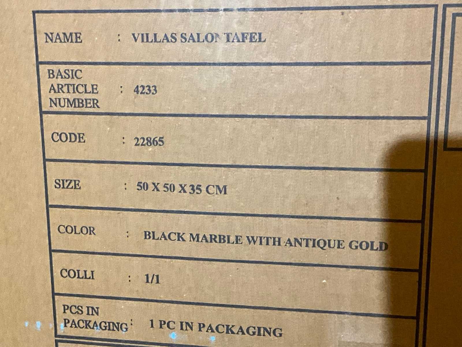 Marmeren blad Goudkleurig metalen onderstel Zware uitvoering Kavel bevindt zich in doos. Model: Villas Lengte: 50cm Breedte: 50cm Hoogte: 35cm