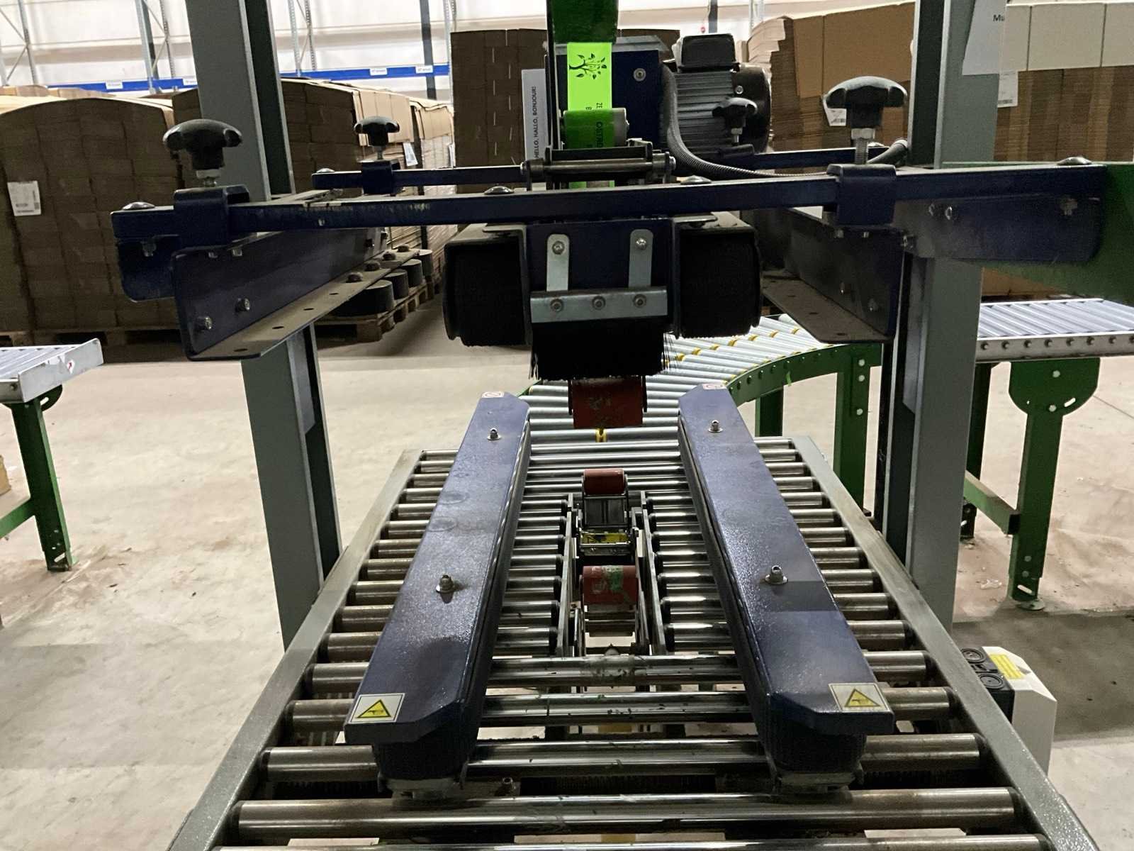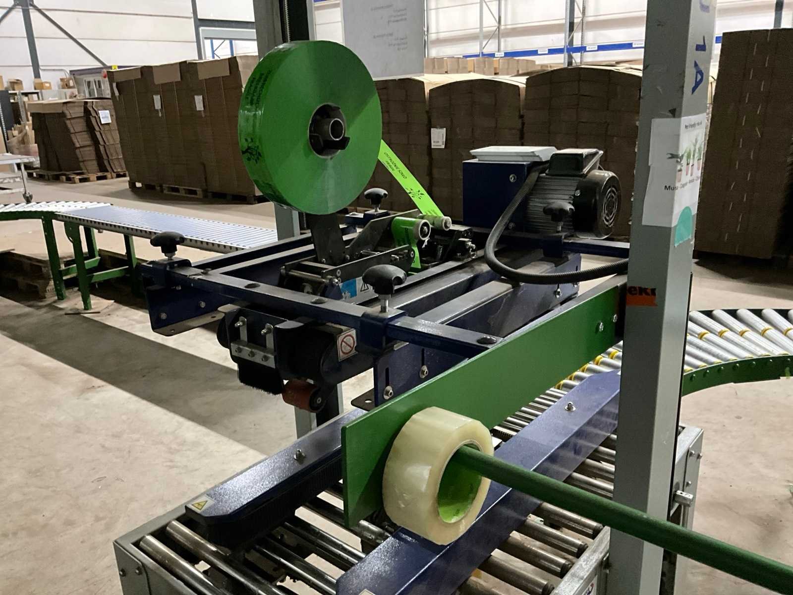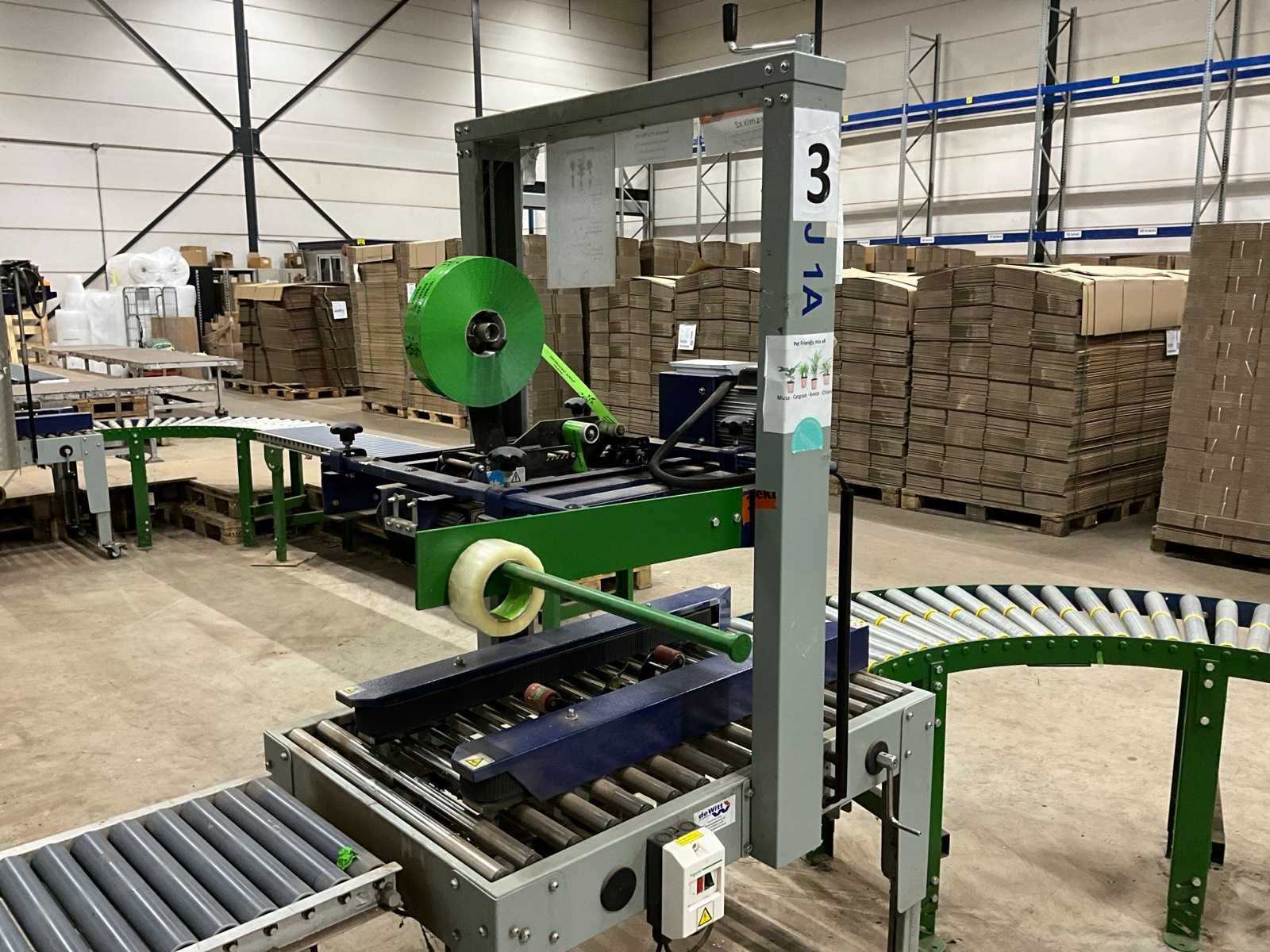 Zowel de boven- als onderkant van dozen; Doos afmetingen: Breedte: 120 - 480mm en hoogte tot circa 100cm; 600W; voorzien van 1x rollenbaan H74xB45xL150cm, 1x rollenbaan bocht H75xB45xL110cm en 1x rollenbaan H75xB45xL600 Merk: YoungSunpack Type: MH-FJ-1A Bouwjaar: 2021 Serienummer: 210128CS1-358 Aansluiting: 230V Totale afmeting L: 1100mm Totale afmeting Breedte: 900mm Totale afmeting Hoogte: 1600mm
