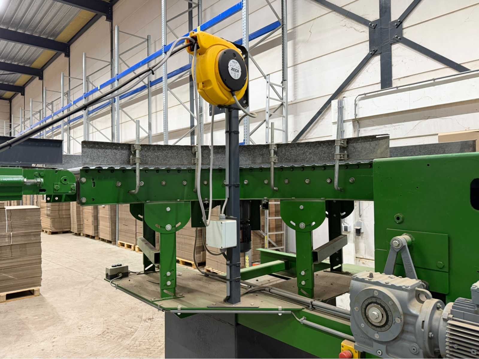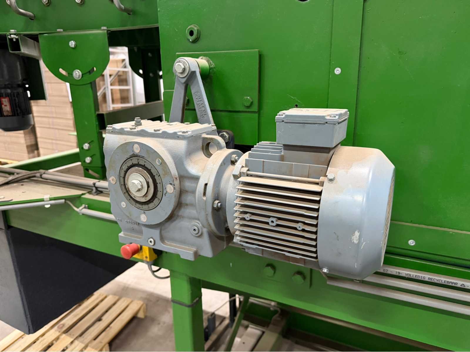 Zowel de boven- als onderkant van dozen; Doos afmetingen: Breedte: 120 - 480mm en hoogte tot circa 100cm; 400W; voorzien van elektrisch aangedreven rollenbaan met afmeting H75xB62xL5350cm (te demonteren in kleinere delen); 1x bocht elektrisch aangedreven rollenbaan H74xB55xL150cm; 1x bocht elektrisch aangedreven rollenbaan H147xB55xL150xm, 2x bocht elektrisch aangedreven rollenbaan H195xB55xL150xm, transportband H87xB55xL140cm; transportband H147xB55xL140cm transport opvoerband H90/147xB55xL675; transport opvoerband H90/147xB55xL500cm; mobiele elektrisch aangedreven transportband H197xB55xL400cm; elektrisch aangedreven transportband op geleiderail H185xB95xL850cm; voorzien van besturingskast. Merk: YoungSunpack Type: MH-FJ-1D Bouwjaar: 2012 Max. formaat l: 480mm Max. formaat b: 480mm Aansluiting: 230V Eigen gewicht: 100kg Totale afmeting L: 1100mm Totale afmeting Breedte: 900mm Totale afmeting Hoogte: 1600mm