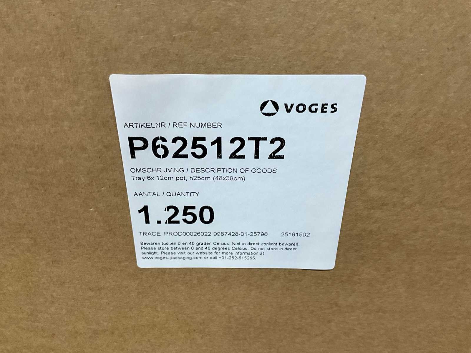 Verzend of transport tray (Tray afmetingen ca. 48x38x12,5cm) voor 6 planten in ø12x9cm potten. Maximale lofhoogte 25cm; in 3 pallets, 1 pallet aangebroken Merk: Voges Type: P62512T2