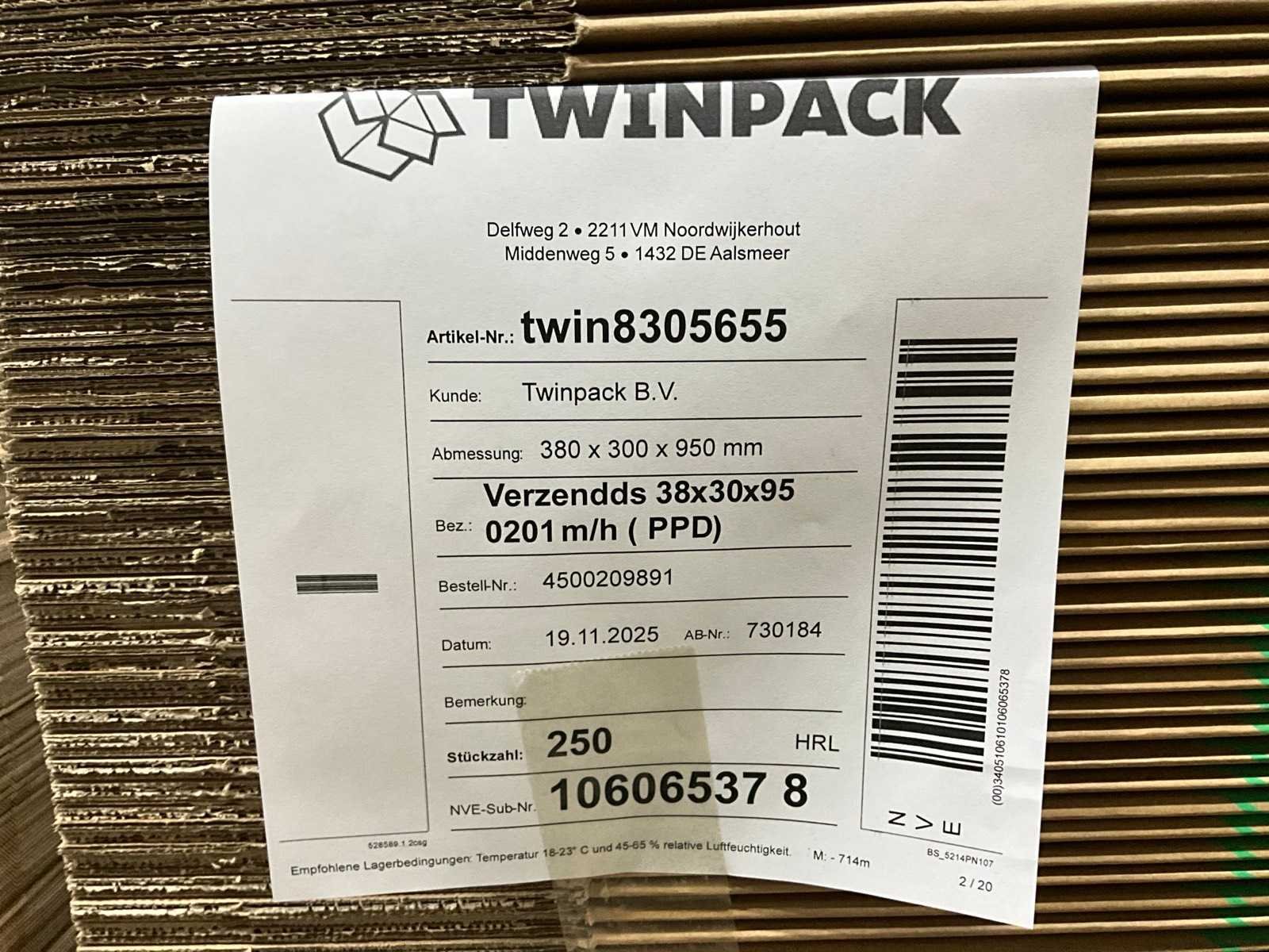 Op 24 pallets Merk: Twinpack Afmeting h: 950mm Afmeting l: 380mm Afmeting b: 300mm