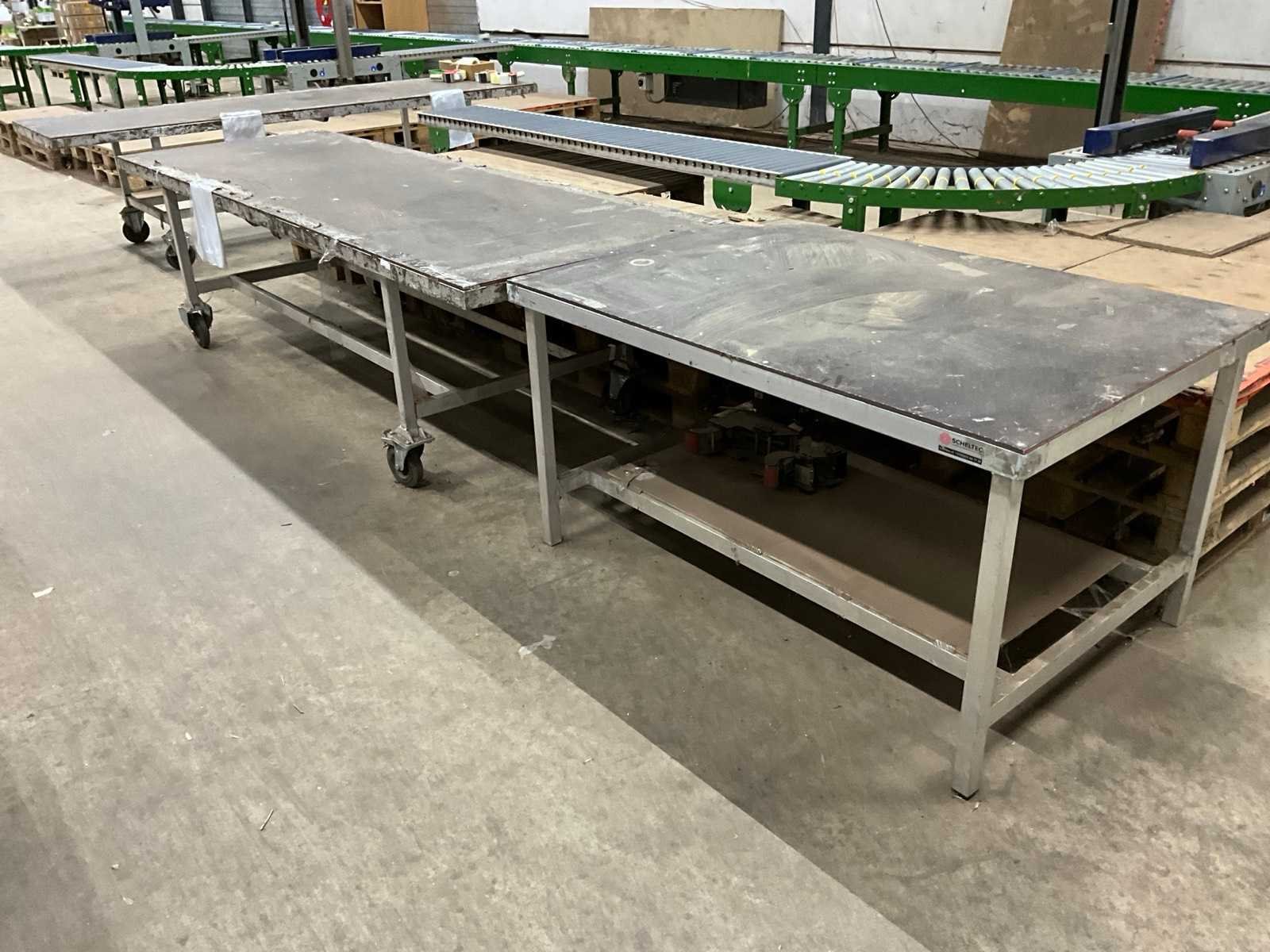 Bestaande uit: 4x houten ladekast H108xB45xD40cm, verrijdbare werktafel H100xB82xL173, werktafel met metalen frame H80xB100xL150cm en 2x verrijdbare werktafel H80xB100xL300cm