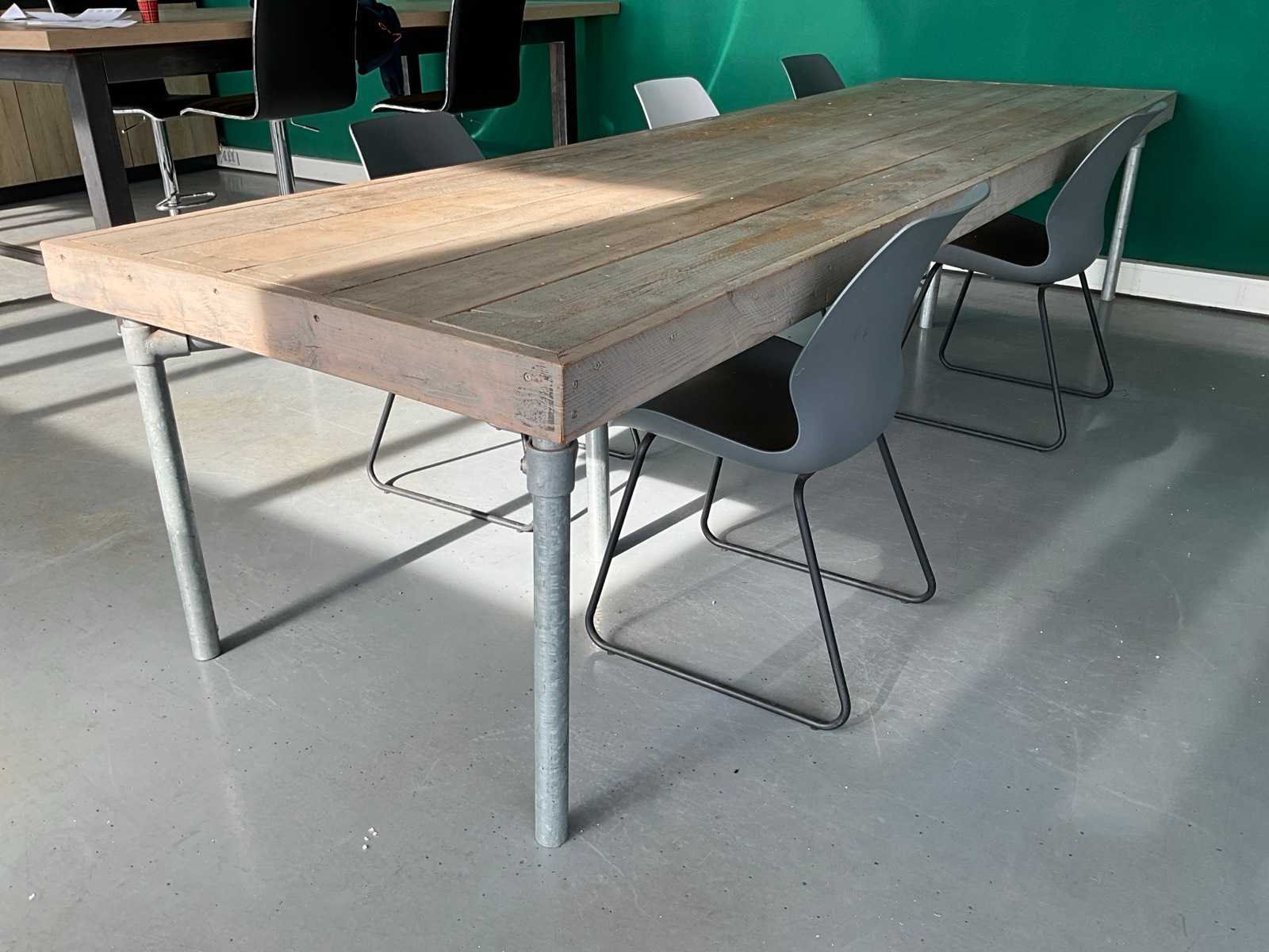Inclusief 5x kunststof kuipstoel met metalen frame Lengte: 352cm Breedte: 105cm Hoogte: 77cm Materiaal: Hout en metaal