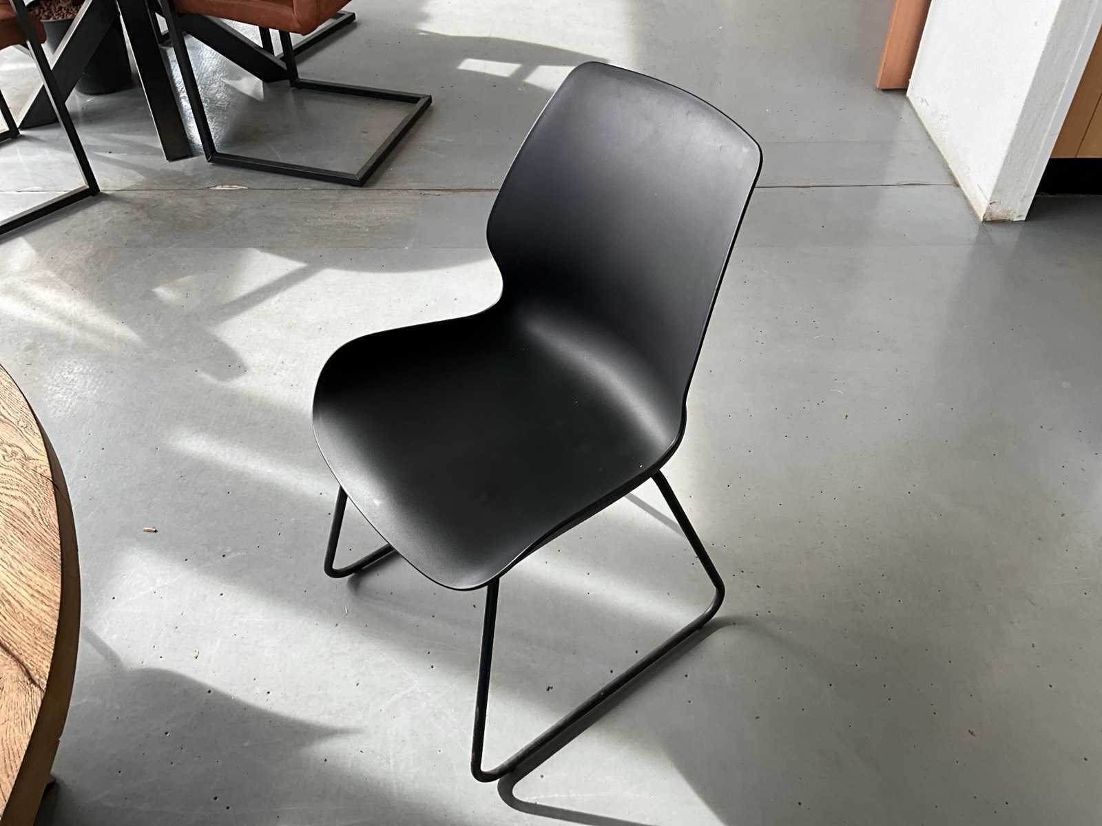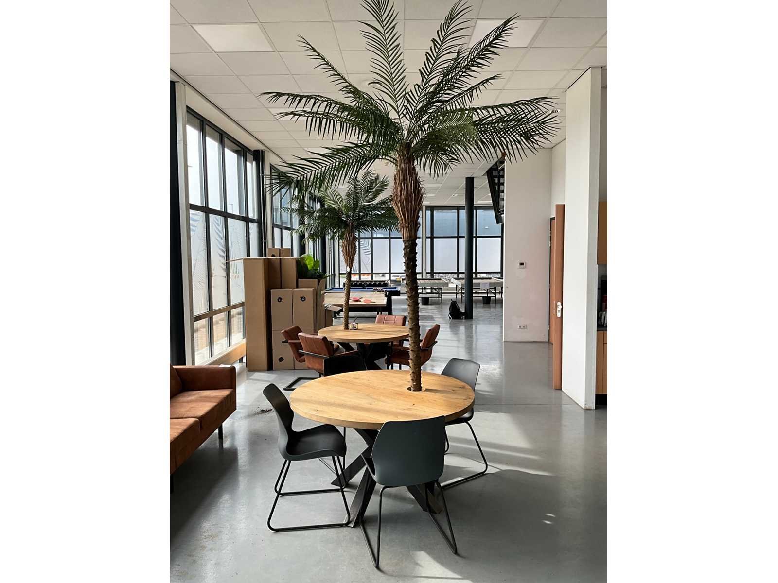 Bestaande uit 2x ronde tafel, 4x kunststof kuipstoel met metalen onderstel, 4x eetkamerstoel met sledeframe en 2x kunstplant door tafel, hoogst gemeten kunstplant 350cm Lengte: 130cm Breedte: 130cm Hoogte: 76cm Materiaal: Hout en metaal