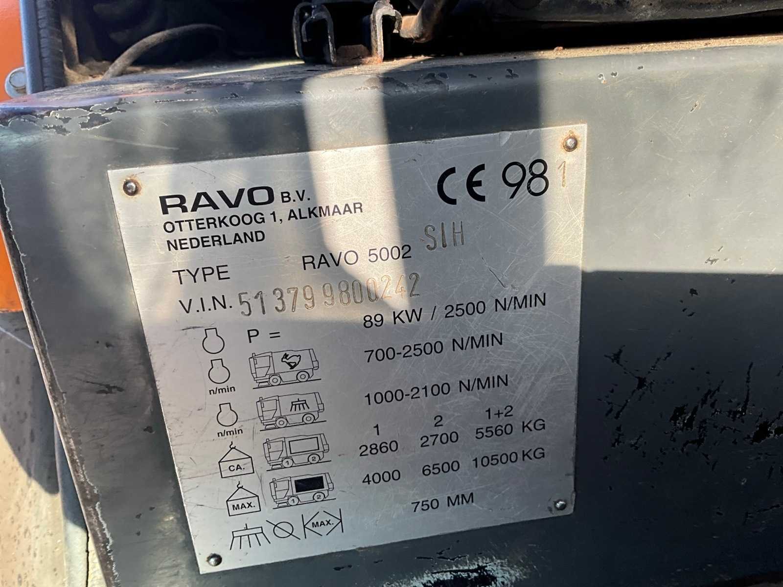2x hydraulisch schuifbare kantenborstels, zuigmond, automatisch smeersysteem Merk: ravo Type: 5002-SIH Bouwjaar: 2001 Kenteken: TSR-78-V Serienummer: 513799800242 Afgelezen urenstand: 8716 Brandstofmotor aangedreven: true Brandstof: diesel Vermogen: 89kW Eigen gewicht: 5560kg Merk motor: Iveco Aantal cilinders: 6 Schoonwatertank: true Werkbreedte: 1800mm Totale afmeting L: 4450mm Totale afmeting Breedte: 1800mm Totale afmeting Hoogte: 2700mm