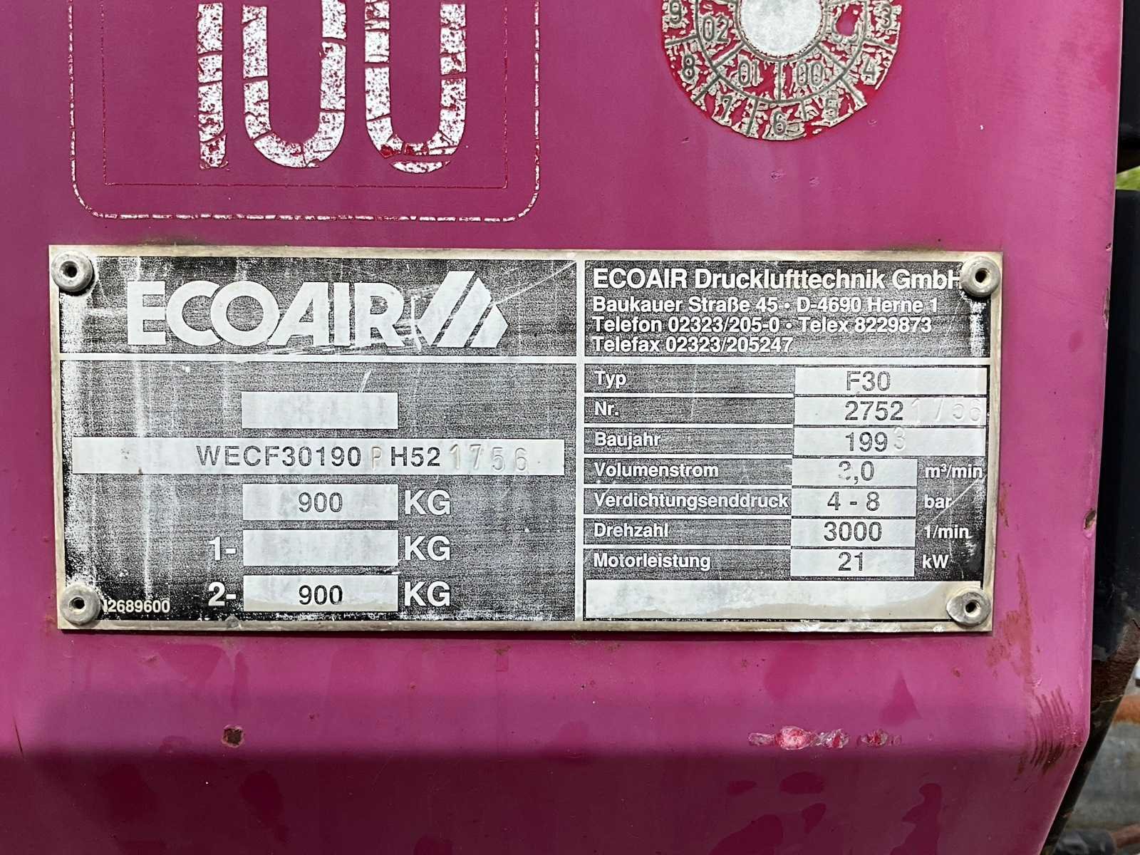 Merk: Ecoair Type: F30 21 kW Bouwjaar: 1993 Serienummer: 27521756 Capaciteit.: 8bar Vermogen: 21kW Afgelezen urenstand: 2324