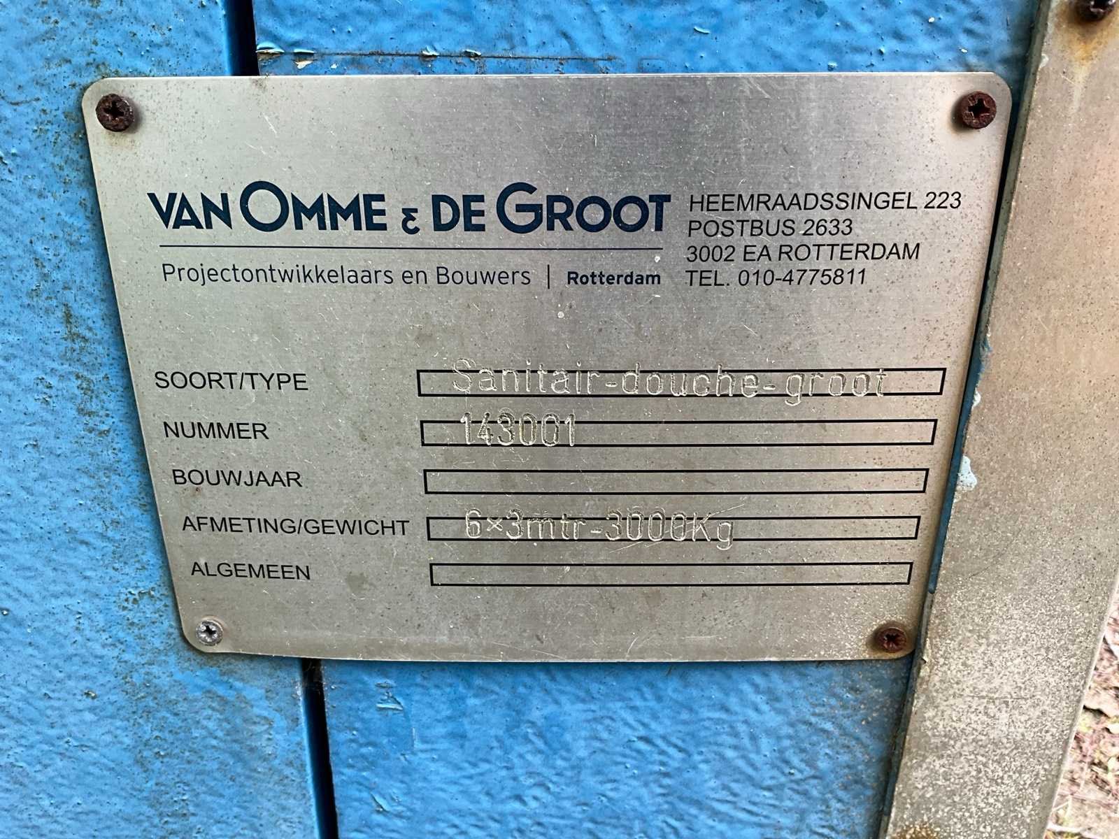 Merk: FORT Type: sanitairunit Serienummer: 143001 Aantal ramen: 2 Eigen gewicht: 3000kg Totale afmeting L: 6000mm Totale afmeting Breedte: 3000mm Totale afmeting Hoogte: 2780mm