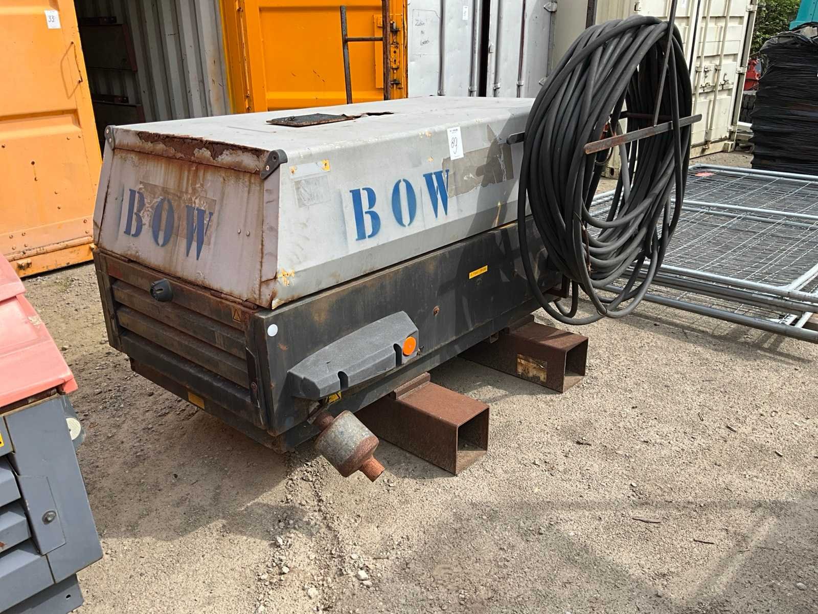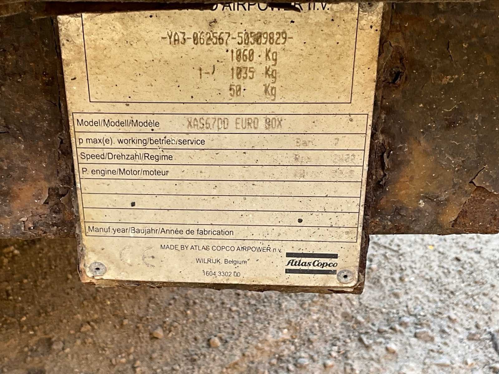 Merk: Atlas Copco Type: XAS 6700 Serienummer: YA3-062567-50509829 Capaciteit.: 7bar Vermogen: 32.5kW Afgelezen urenstand: 959hr Eigen gewicht: 1060kg Totale afmeting L: 1750mm Totale afmeting Breedte: 2150mm Totale afmeting Hoogte: 1650mm