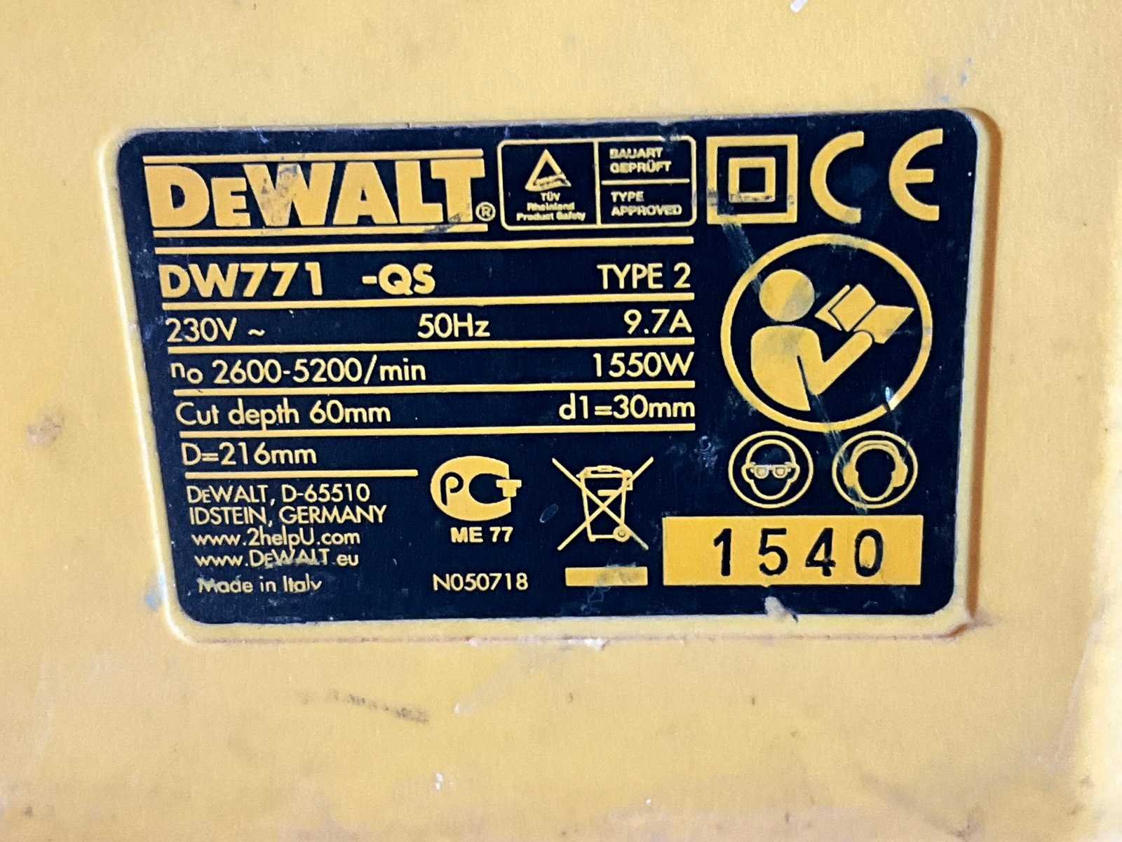 Merk: DeWalt Type: DW771 Serienummer: 1540 Zaagblad Ø: 216mm Verstek: true Motorvermogen (kW): 1.5kW Aansluiting: 230V Totale afmeting L: 600mm Totale afmeting Breedte: 440mm Totale afmeting Hoogte: 400mm