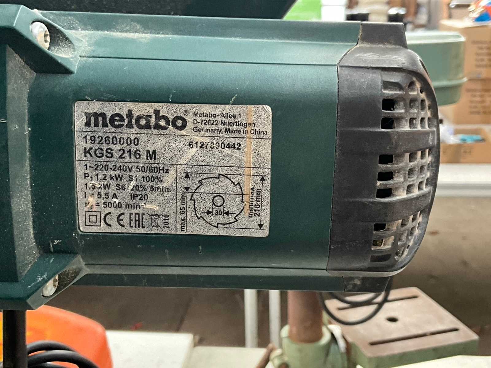 Merk: Metabo Type: KGS 326 M Serienummer: 6127890442 Zaagblad Ø: 216mm Verstek: true Motorvermogen (kW): 1.2kW Aansluiting: 230V Totale afmeting L: 600mm Totale afmeting Breedte: 440mm Totale afmeting Hoogte: 400mm
