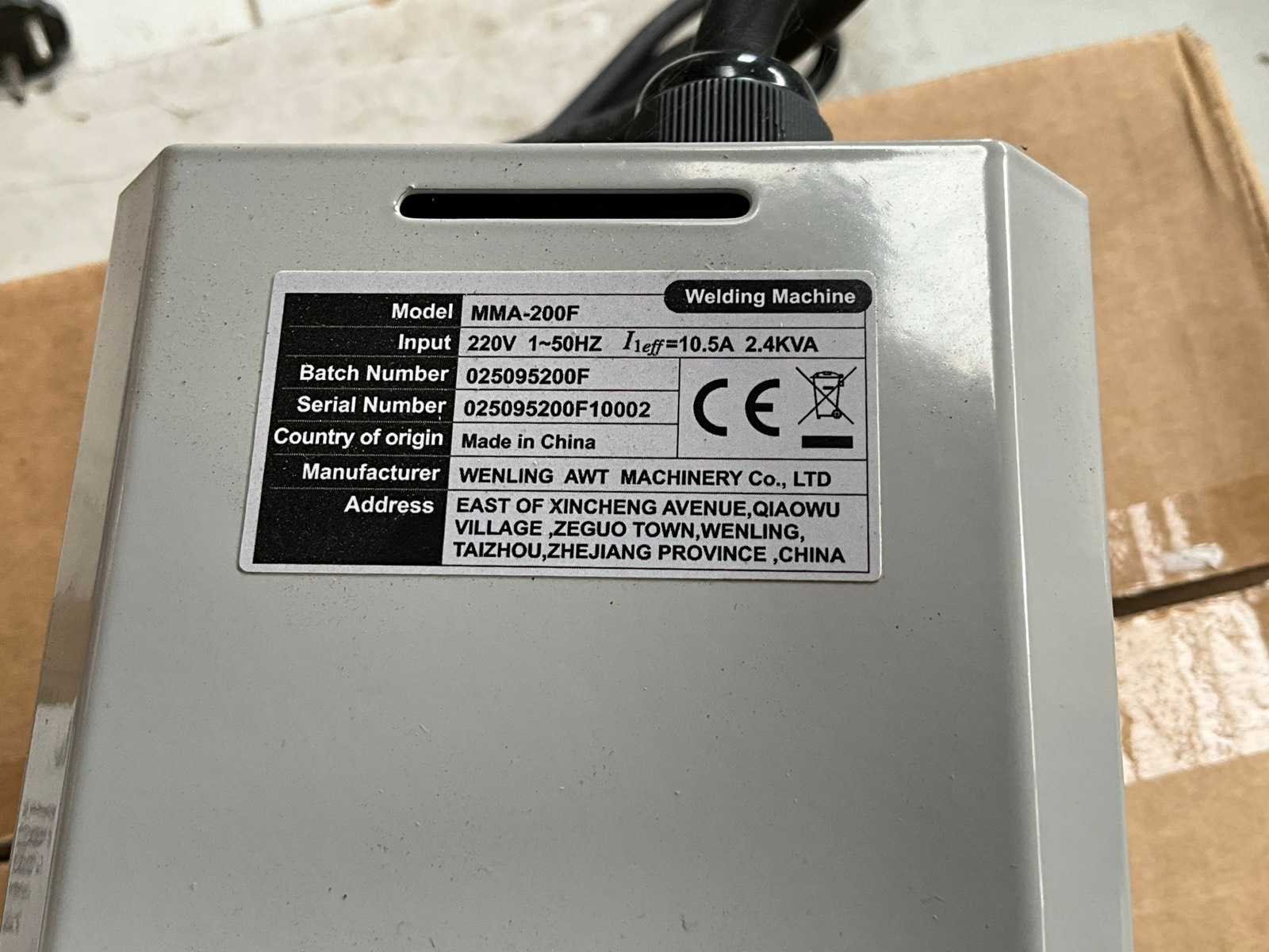 Merk: Azzuno Type: MMA-200F Serienummer: 025095200F10002 Aansluiting: 220V