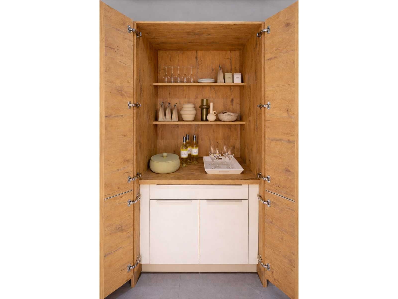 Reeds gedemonteerd en ingepakt op pallets. (afstapelen, omruilen of statiegeld per pallet); pallets zijn niet inbegrepen; statiegeld betalen bij afhalen, of pallets afstapelen; werkblad niet ingepakt op pallets (26-IMP-04265) Merk: Impuls Lengte: 103,2cm Breedte: 60cm Hoogte: 220,6cm Aanrechtblad: Kunststof eikenlook Kleur: Eikenlook + magnolia wit