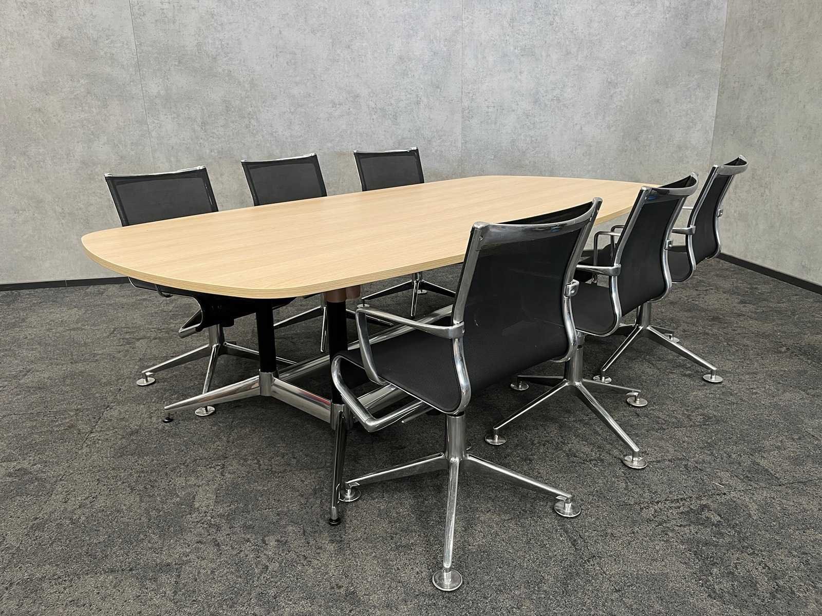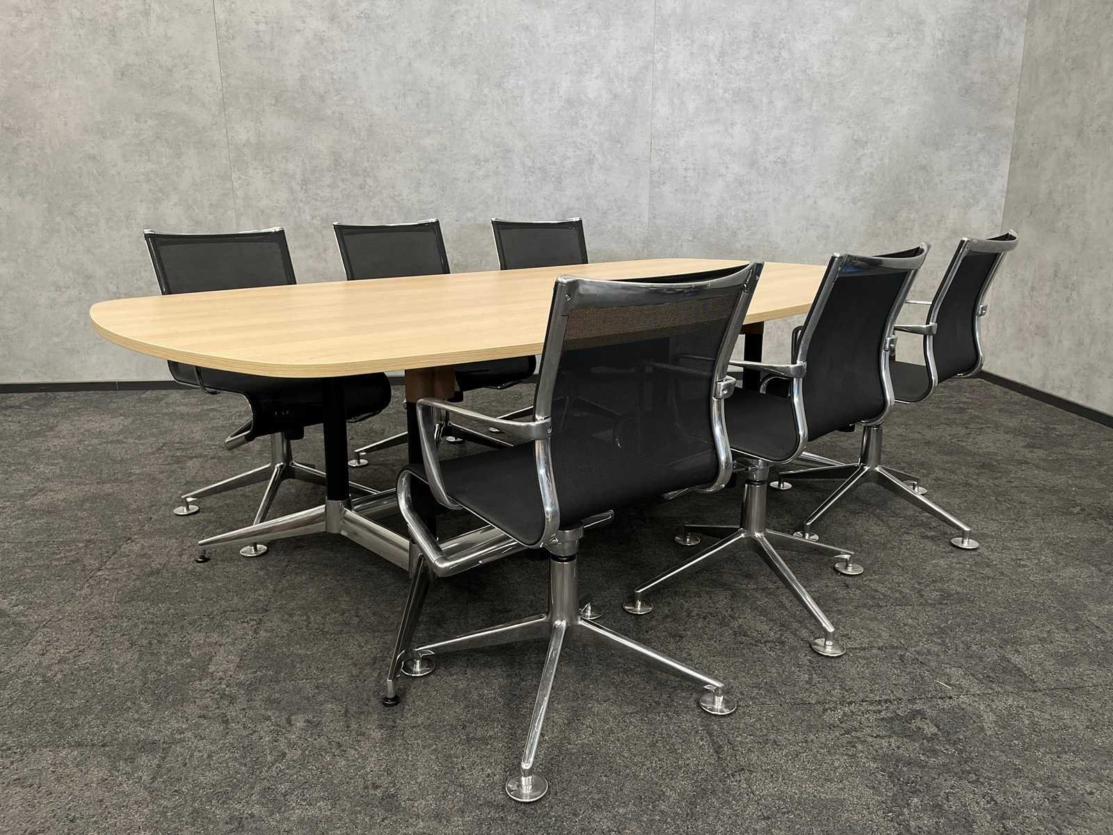Kavel bestaande uit 6x Alias draaibare design conferentiestoel, zithoogte instelbaar. design van Alberto Meda ---- 1x nieuwe conferentietafel v.v. nieuw eikenlook melamine tafelblad en nieuw zwart/chroom stalen frame (in doos) -- tafel is reeds professioneel gedemonteerd (het tafelblad is onverpakt) Merk: Alias Kleur: eiken, chroom, zwart Lengte: 250cm Breedte: 130cm Hoogte: 74cm