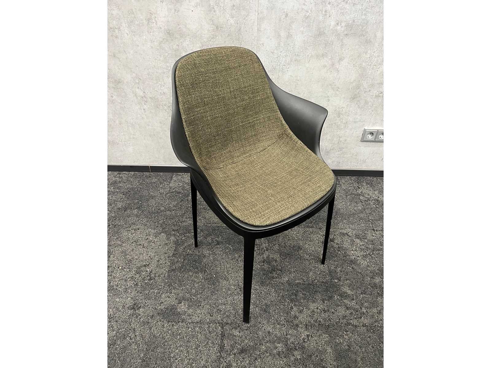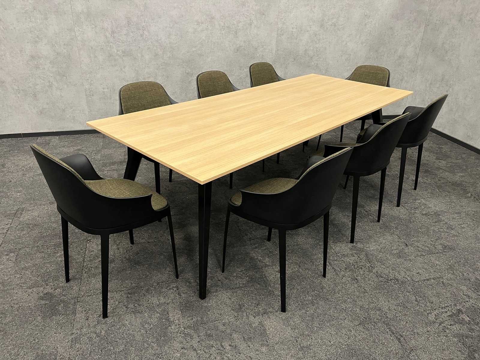 Kavel bestaande uit 8x Alias Elle design stoel en 1x vergadertafel v.v. zwart stalen frame en eikenlook melamine tafelblad Merk: Alias Elle Kleur: groen, zwart, eiken Lengte: 240cm Breedte: 100cm Hoogte: 74cm Zithoogte: 48cm