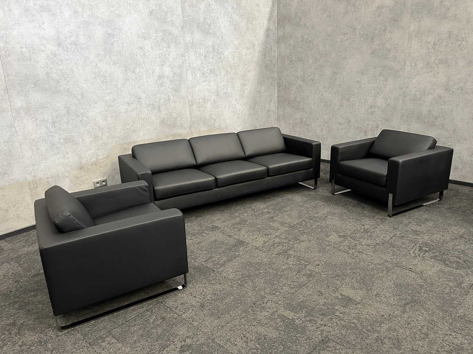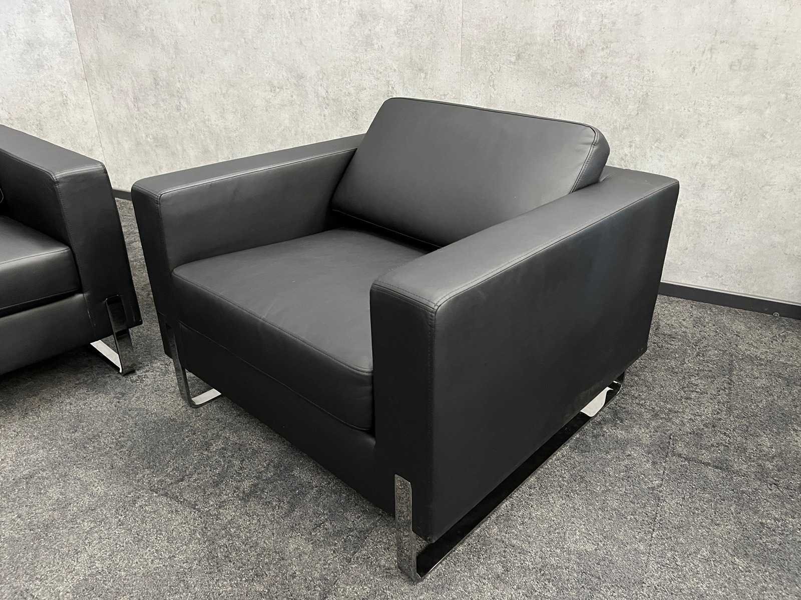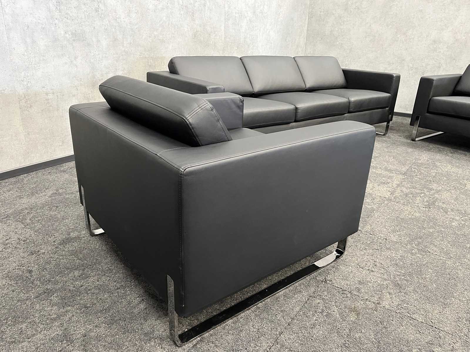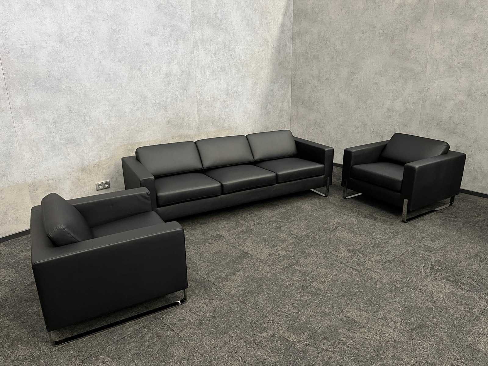 Afm. sofa ca. hxbxd 70x220x85 cm. -- Afm. fauteuil ca. hxbxd 70x90x85 cm. Merk: Profim Kleur: zwart, chroom Zithoogte: 44cm