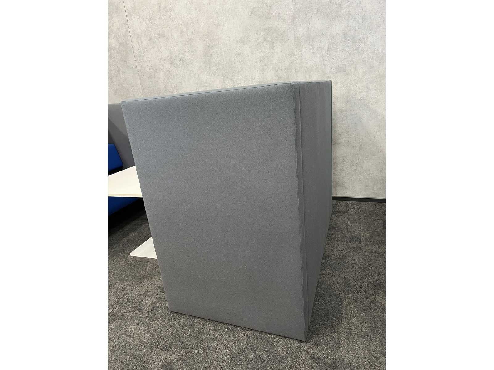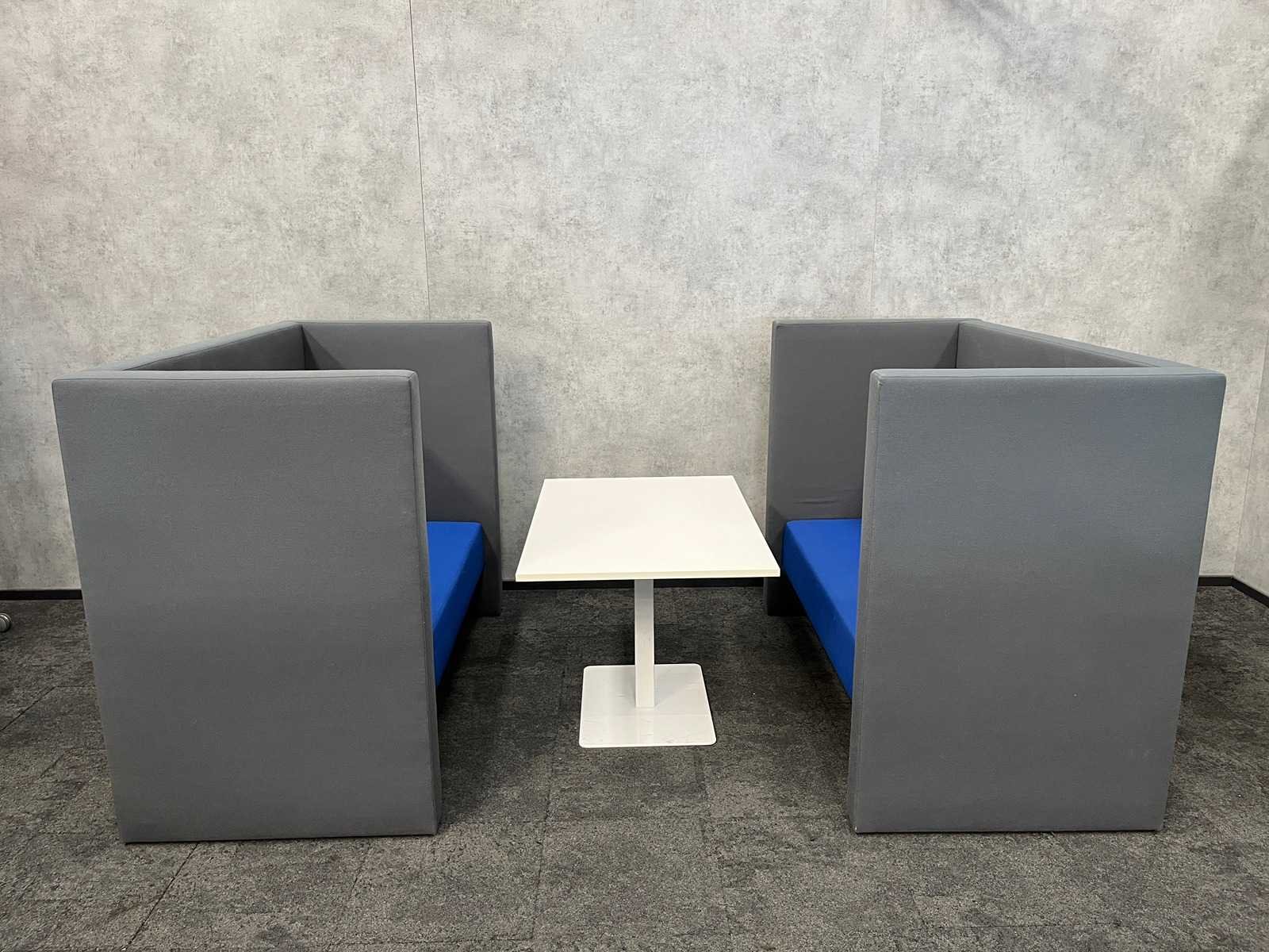 Afm. sofa's ca. hxbxd 138x180x90 cm. -- Afm. tafel ca. hxbxd 75x120x80 cm. Kleur: blauw, grijs, wit Materiaal: metaal, textiel
