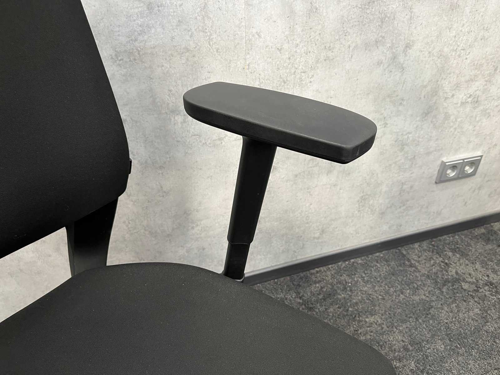V.v. 4D verstelbare armleggers, zwarte bekleding, kantelmechanisme rugleuning/ actief zitten, zithoogte en zitdiepte verstelbaar, chroom 5-teens voetenkruis. Merk: klöber Kleur: zwart, chroom