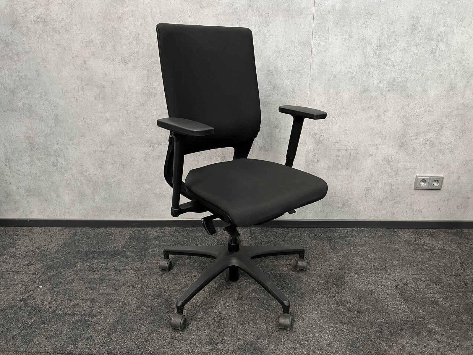 V.v. 4D verstelbare armleggers, zwarte bekleding, kantelmechanisme rugleuning/ actief zitten, zithoogte en zitdiepte verstelbaar, chroom 5-teens voetenkruis. Merk: klöber Kleur: zwart, chroom
