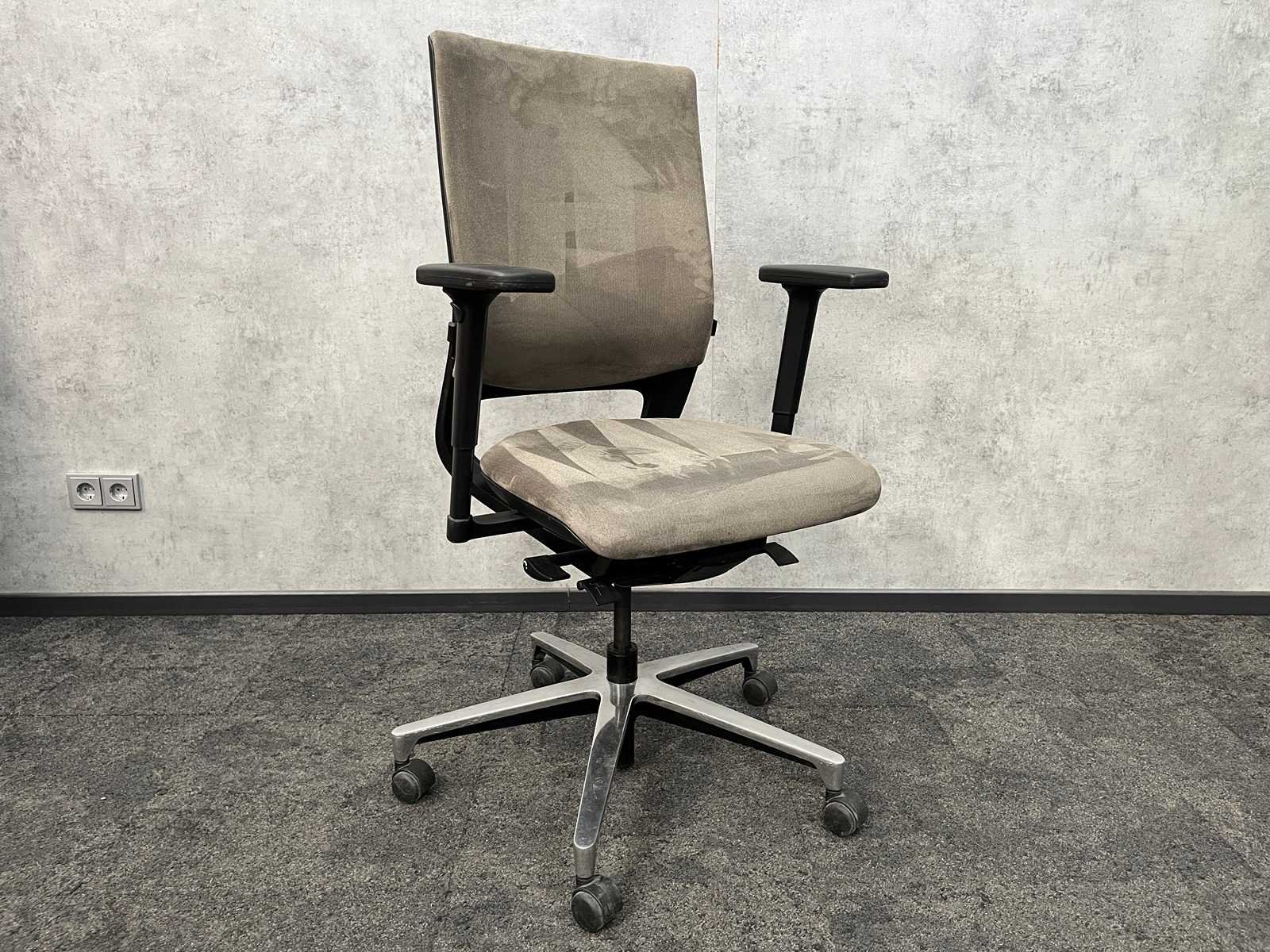 V.v. 4D verstelbare armleggers, taupe bekleding, kantelmechanisme rugleuning/ actief zitten, zithoogte en zitdiepte verstelbaar, chroom 5-teens voetenkruis. Merk: klöber Kleur: taupe, zwart, chroom