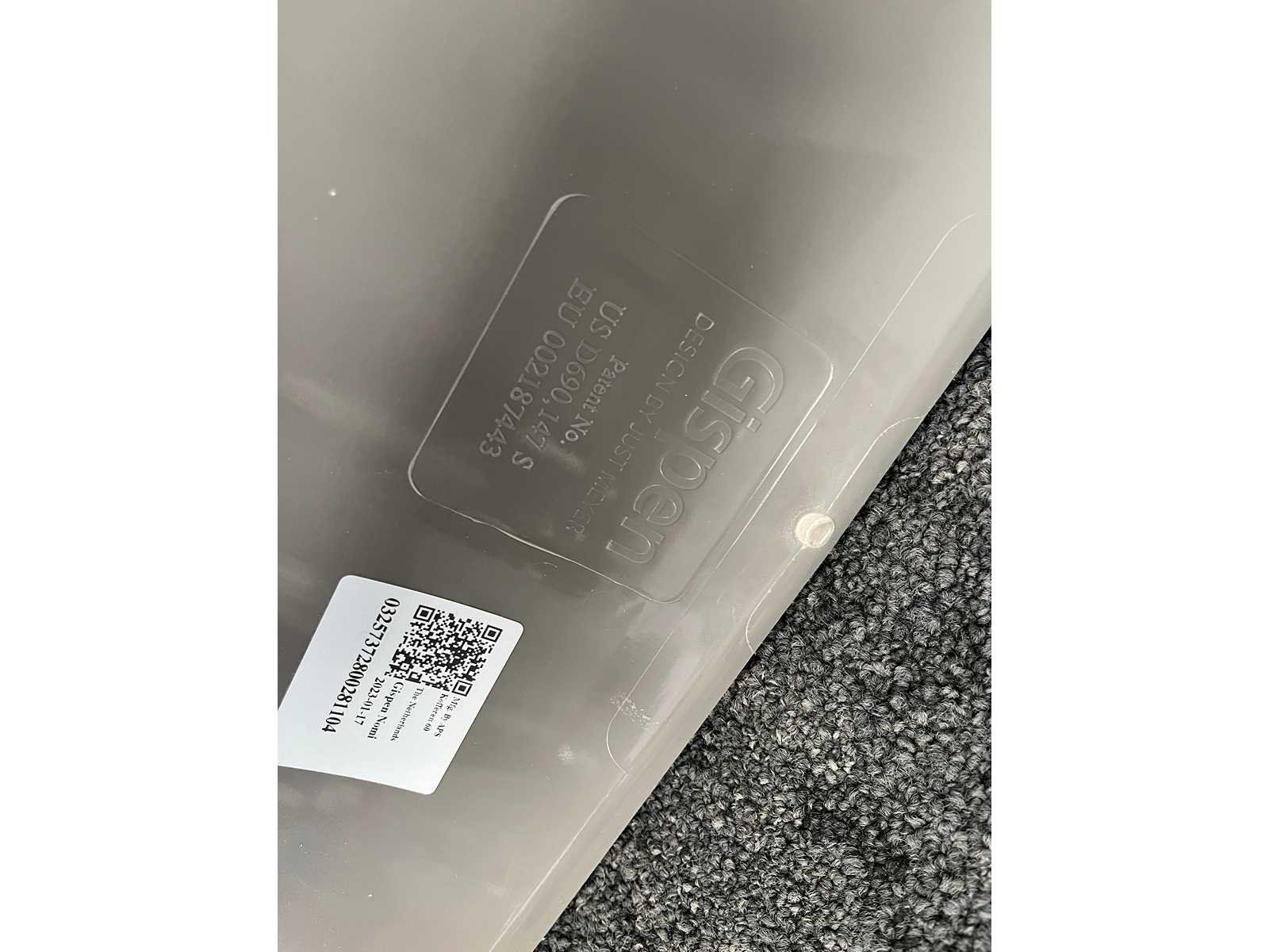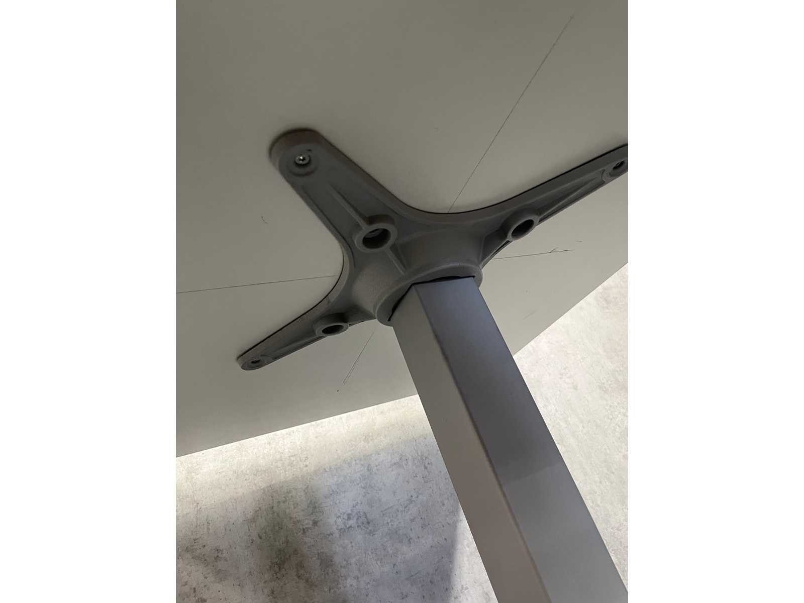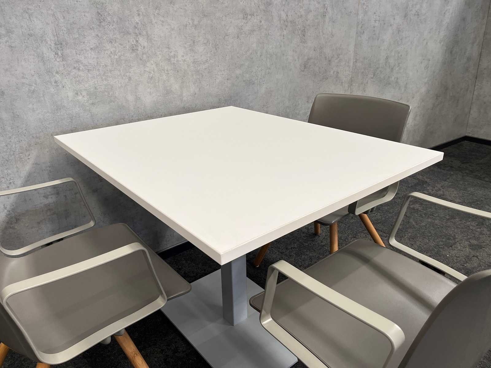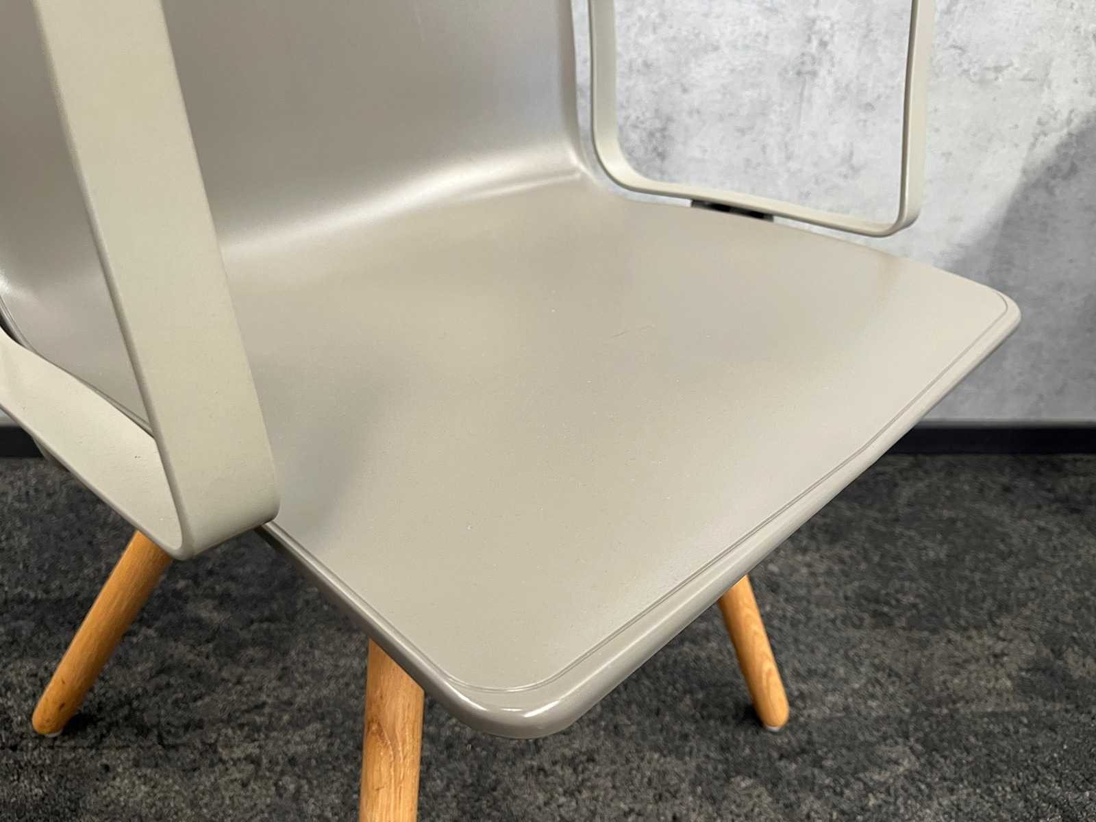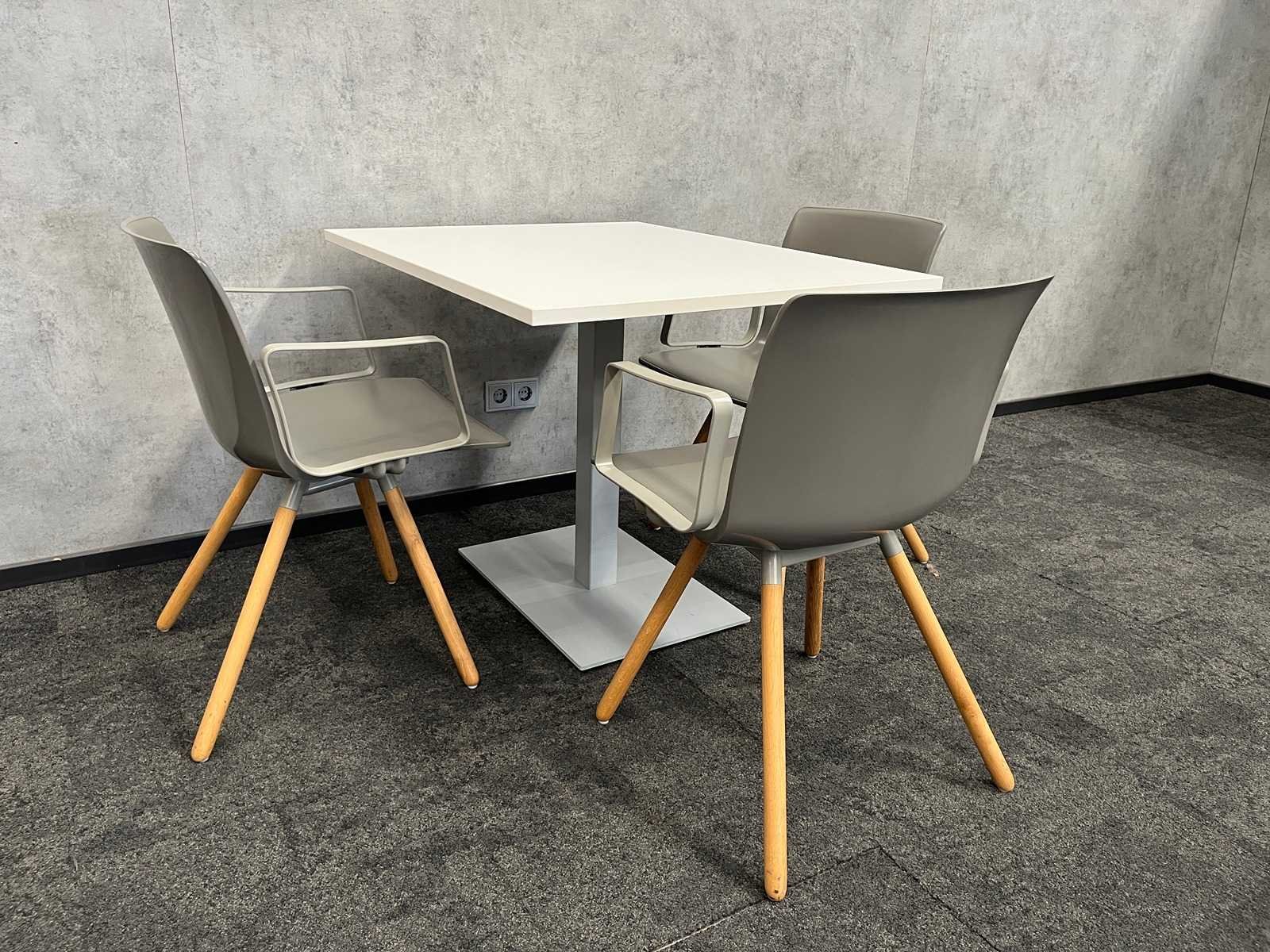 Kavel bestaande uit 3x Gispen Nomi design stoel. Design van Just Meijer. -- 1x tafel v.v. wit melamine blad en grijs stalen frame. Afm. tafel ca. hxbxd 74x80x100 cm. Merk: Gispen Nomi Kleur: grijs, hout, wit