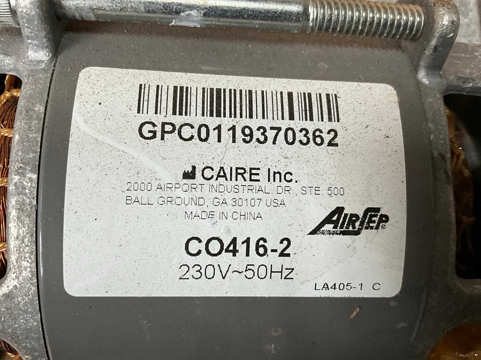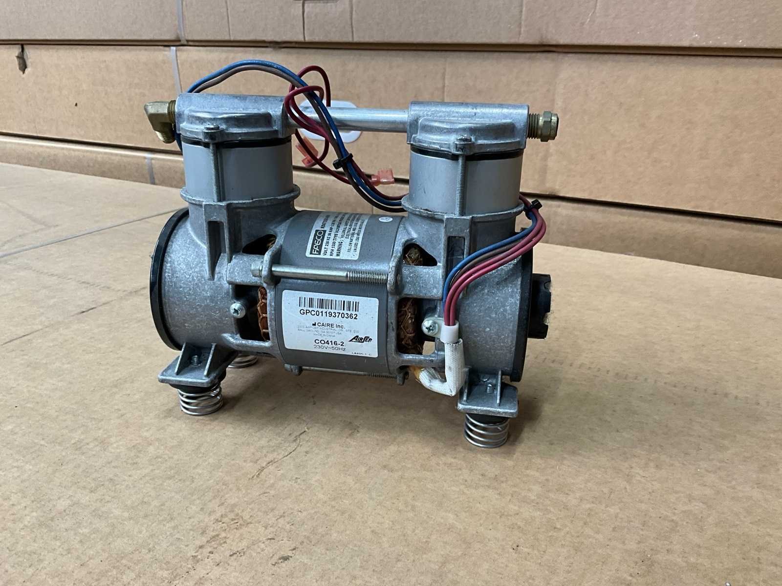 Dubbele luchtpomp van CAIRE (AirSep), type CO416-2, uitgevoerd met FASCO elektromotor. Aansluitspanning 230 V. Geschikt voor lucht- en beluchtingstoepassingen. Merk: Caire Model: CO416-2 Lengte: 25cm Breedte: 10cm Hoogte: 19cm