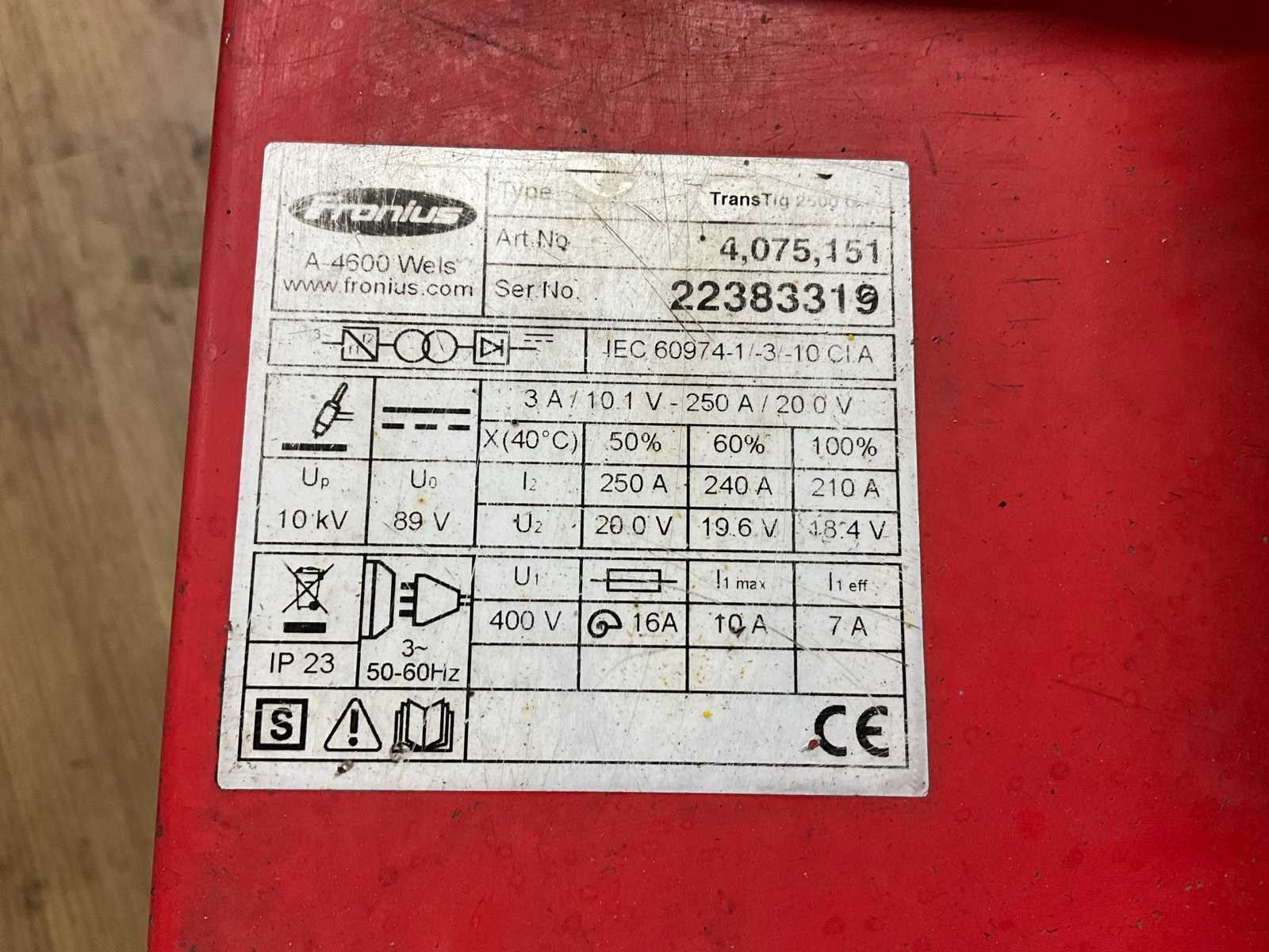 Merk: Fronius Type: TransTig 2500 Inschakelduur: 50% Max. lasvermogen: 250A Aansluiting: 400V Digitale uitlezing: true