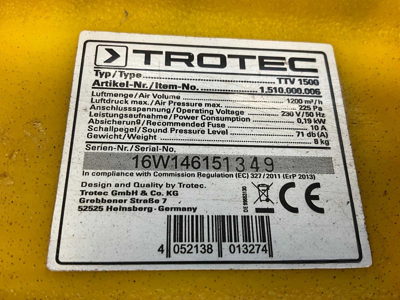 Merk: Trotec Type: TTV1500 Bouwjaar: 2013 Vermogen: 0.19kW Ventilator: true Eigen gewicht: 8kg