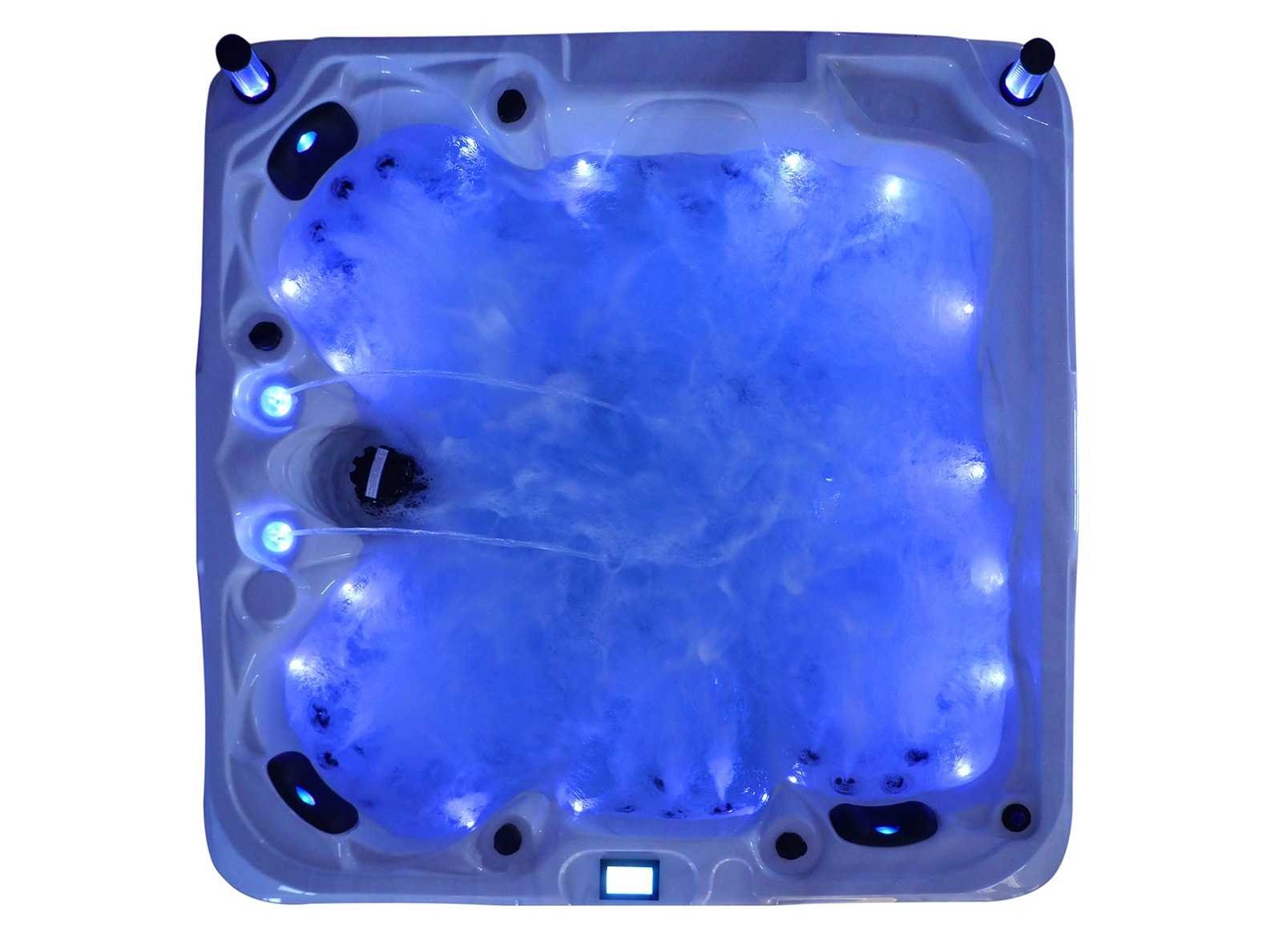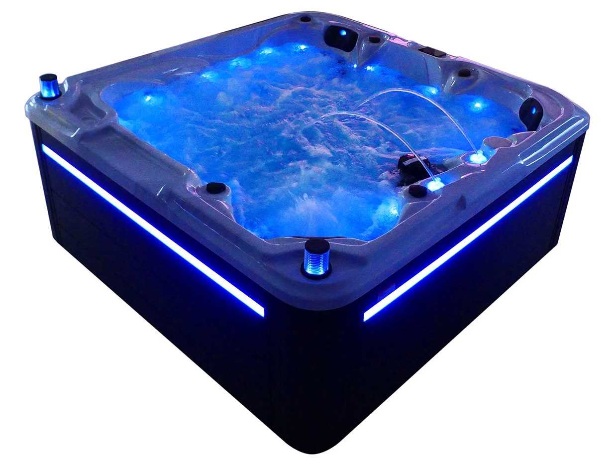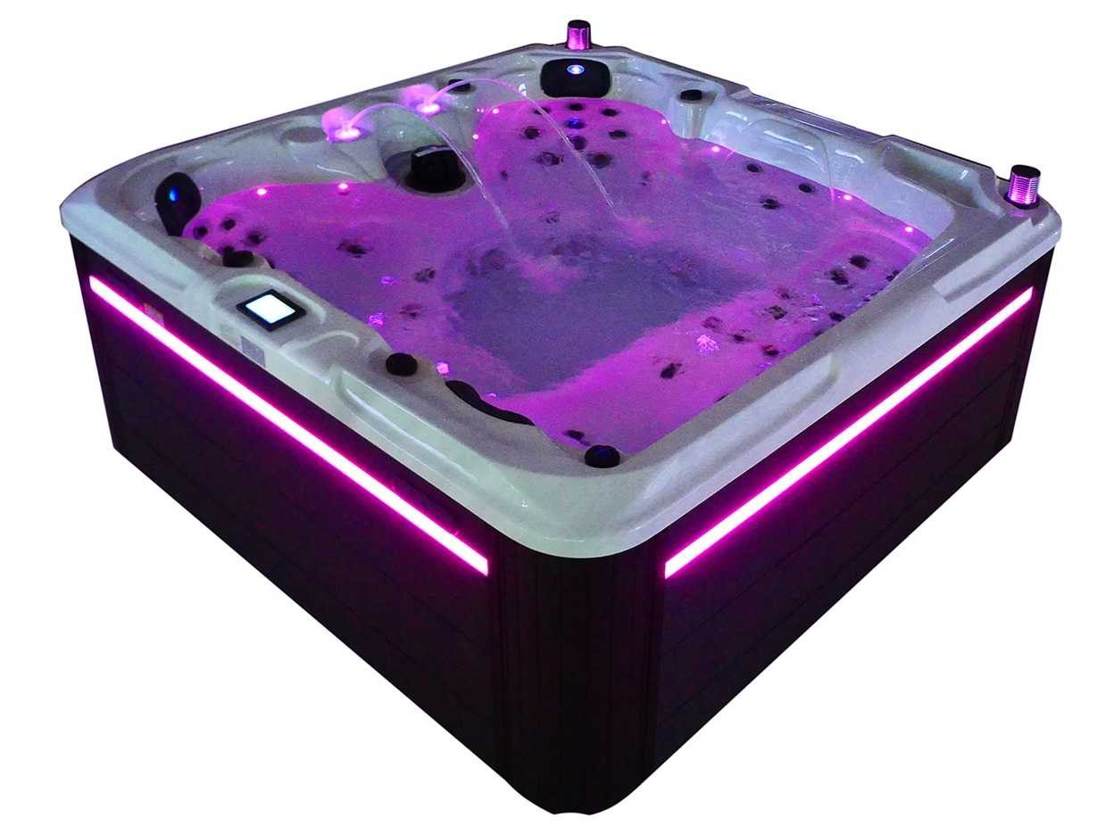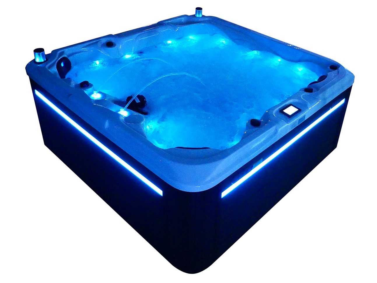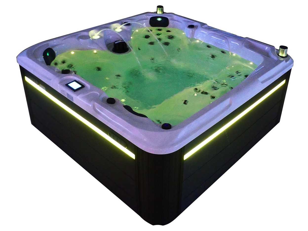 Besturing balboa (Balboa BP21 computer + nieuwste Spa touch 3 display), Balboa heater (3000 watt), Balboa wifi (voor besturing op afstand met de telefoon/tablet), Balboa bluetooth audio, 2 popup speakers met ledverlichting, Subwoofer, kunststof onderhoudsvrije ombouw met ledverlichting rondom in de zijpanelen, 4 massage pompen (1* 2,5pk, 2* 2pk en 1* 400 watt luchtpomp), 24h circulatiepomp (0,5pk), 4 zitplaatsen en 1 ligplaats (3 plaatsen voorzien van hoofdkussen), dikke (zwarte) afdek cover inclusief, totaal 83 rvs stainless steel RVS jets waarvan 14 luchtjets met ledverlichting (diverse maten en verschillende hydro stralen), extra nek en voet massage jets, vorst beveiliging, ozone desinfectie systeem 50mg/h, diverse leds (36 stuks) verlichting langs de waterrand, aroma feeder, 2x pop-up water fontein met ledverlichting, 1x grote waterval met ledverlichting, diverse regelknoppen om de de kracht en de verdeling naar de jets te regelen, 1x oppervlakte en reinigingsfilter, kuip extra dikke foam isolatie (minimaal 45mm) + extra isolatie aan de buitenwanden met folie + 5mm dikke isolatie op de PVC gesloten bdem, waterafvoer, inclusief trapje, Aluminium frame (zeer sterk en roest bestendig) deze spa zit vol met alle mogelijk bestelbare opties, dit betreft een nieuw product in verpakking. De spa kan zowel op 220volt als 380volt worden aangesloten (27a of 41a). Merk: Mawialux Model: Mia Vermogen: 8500W Spanning: 220-380V Filters: 1 Verlichting: diverse leds met kleurentherapie (7 kleuren) op waterniveau Inhoud: 1500l Pompen: 5 Jets: 83 Aantal personen: 5 Kleur: Binnenkuip keuze uit 3 kleuren (H03 zwart, of H06 wit of H12 grijs) met donker zwarte ombouw (kleurkeuze graag doorgeven per email op info@mawialux.nl) Gewicht: 420kg Lengte: 220cm Breedte: 220cm Hoogte: 95cm Materiaal: USA Aristech acryl + Aluminium frame + kunststof ombouw + PVC gesloten bodem